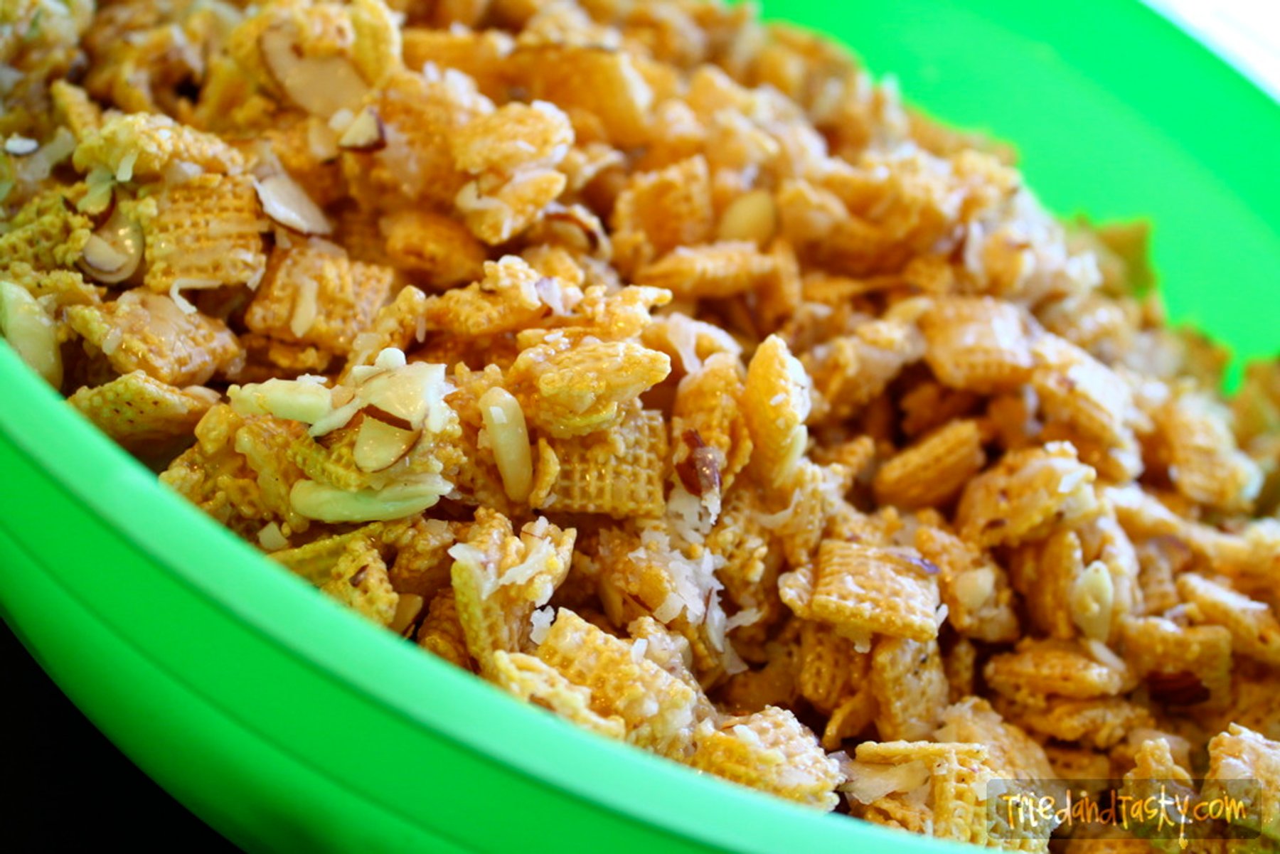 In a large bowl, mix together cereal, coconut, and almonds; set aside. Melt together either in the microwave or in a medium sauce pan the butter, sugar, and corn syrup. Bring to a boil, stirring constantly....