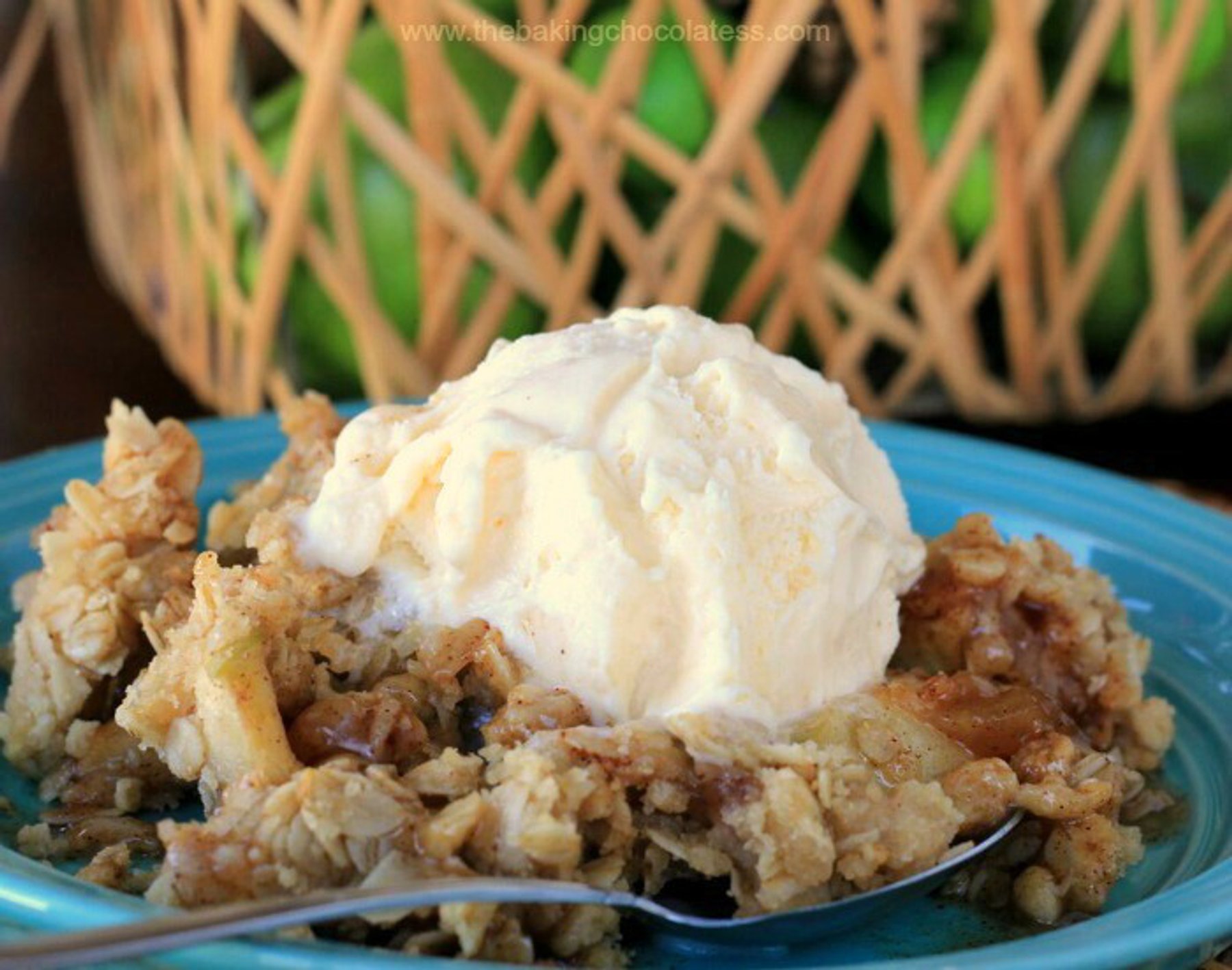 Those Grannies (Granny Smith Apples, in case you were wondering, what the heck…’those grannies?’) are drenched in a delicious maple cinnamon glazey-syrup with a delicious, addictive, golden brown, crunchy oat topping. OMG…big spoonfuls! Do you hear me? BIG SPOONFULS! Beyond Yummy!