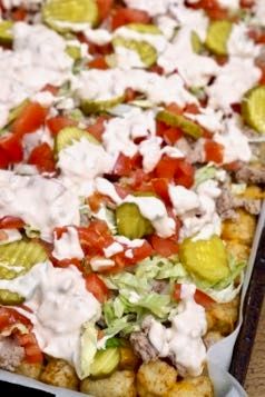 Crispy tater tots are topped with all of the ingredients you would find on a big mac, even the special sauce.