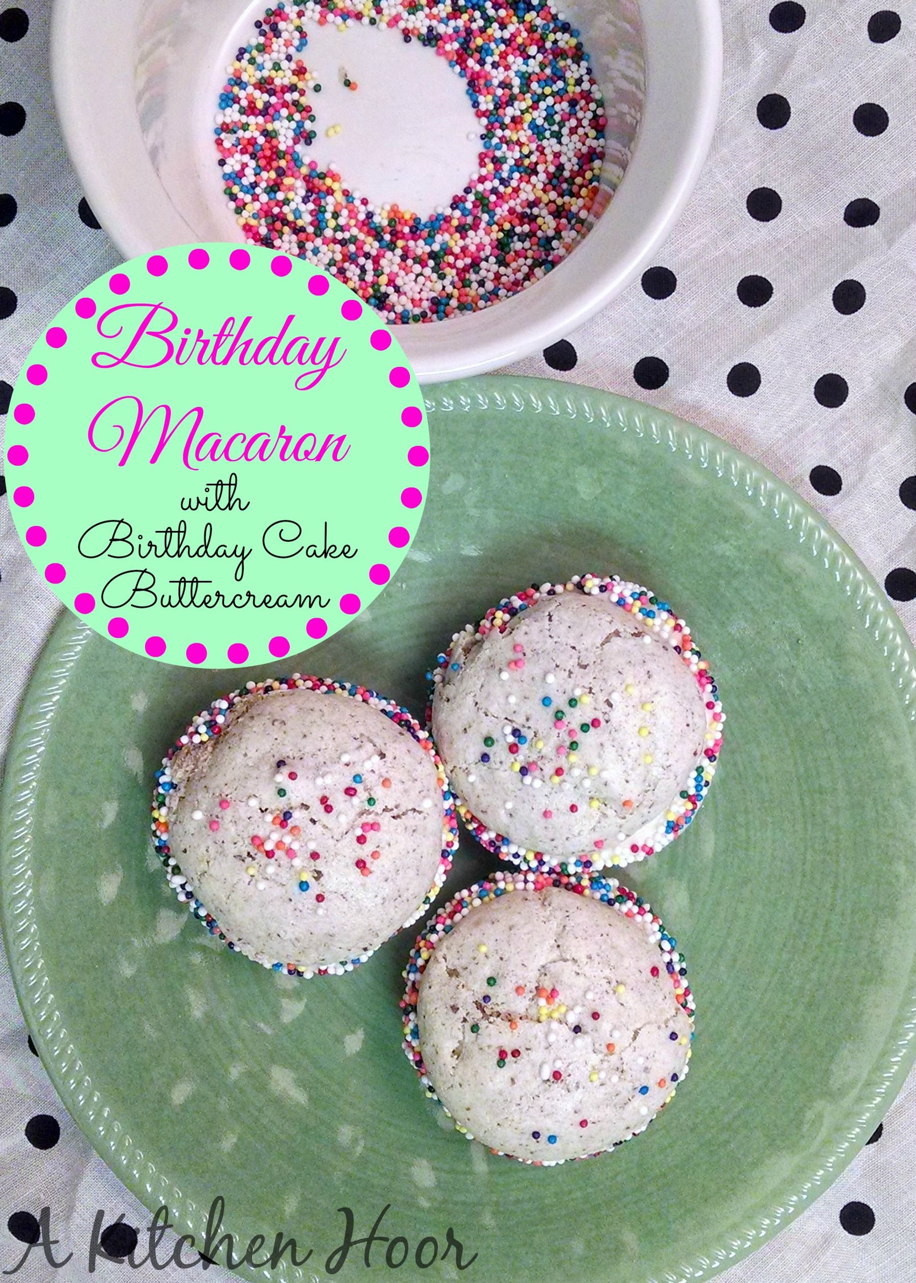 These deliciously delicate French cookies are filled with birthday cake butter cream and coated in rainbow sprinkles!