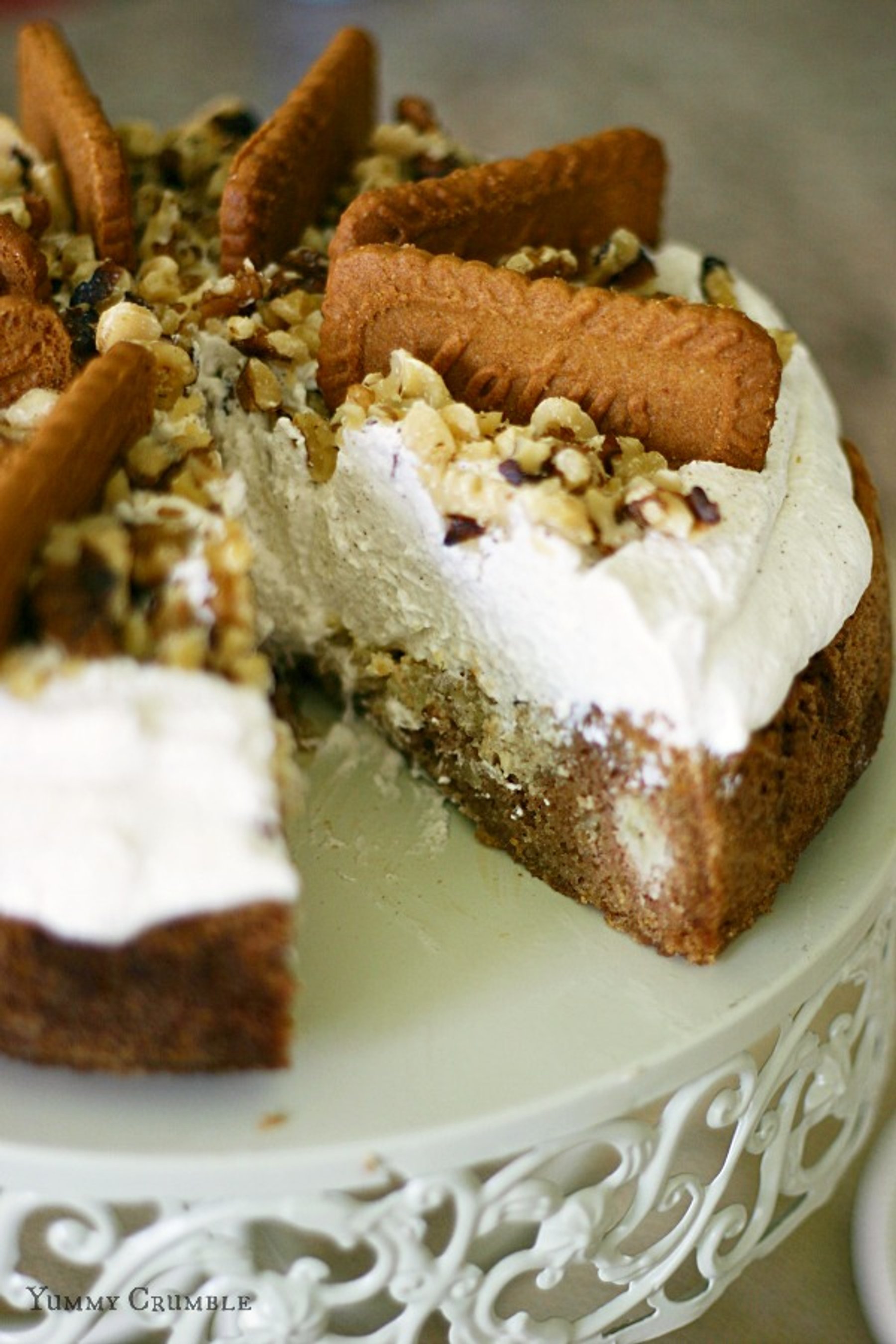 Apple spice cake with Biscoff Cookie Butter mixed right into the batter then swirled with cinnamon and nutmeg spiced cheesecake. Cinnamon whipped cream with chopped walnuts and Biscoff Cookies finish this Biscoff Apple Spice Cake Cheesecake.