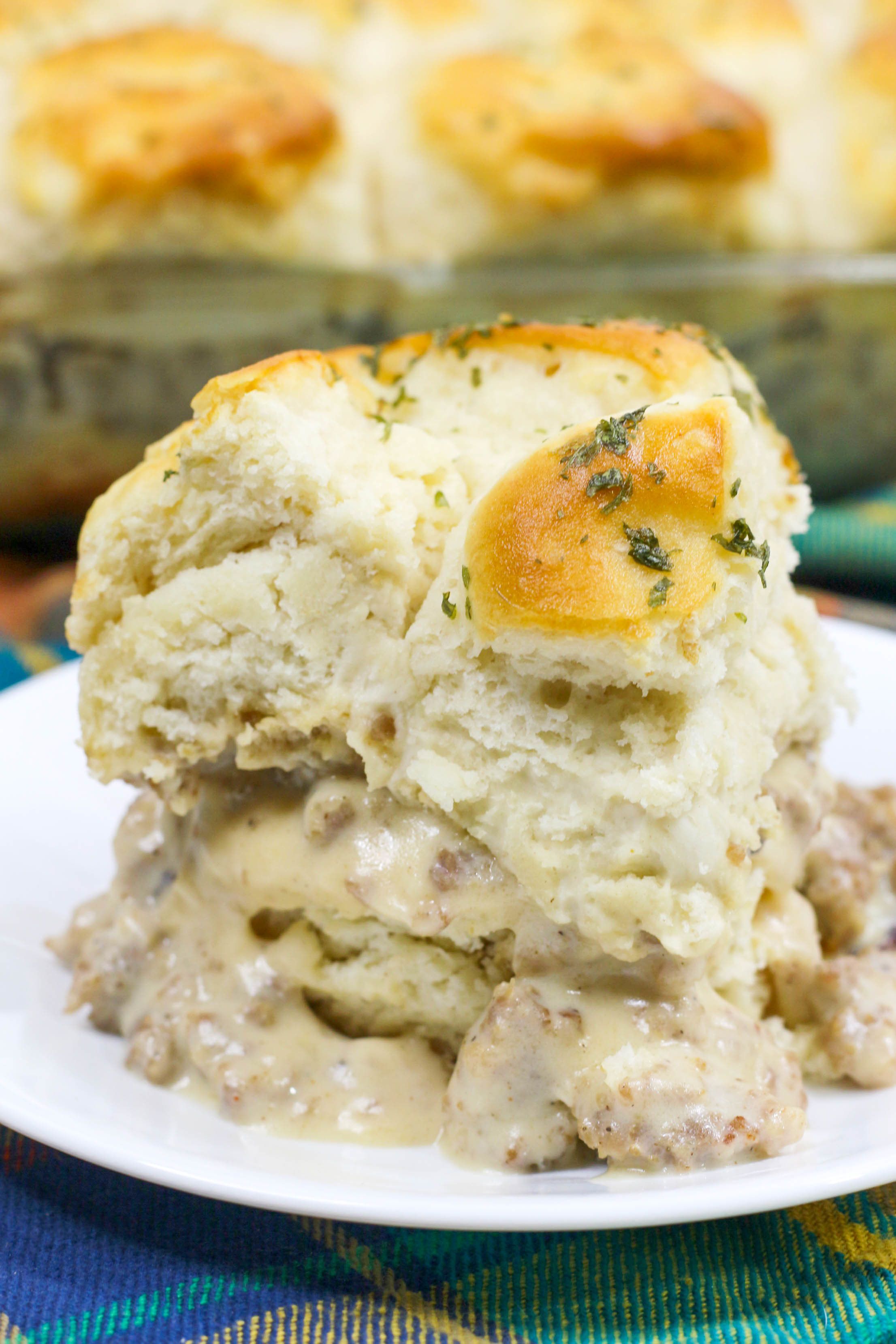 Biscuits and Gravy Casserole: Fluffy buttermilk biscuits with rich sausage gravy. Your favorite breakfast in casserole form, perfect for holidays!