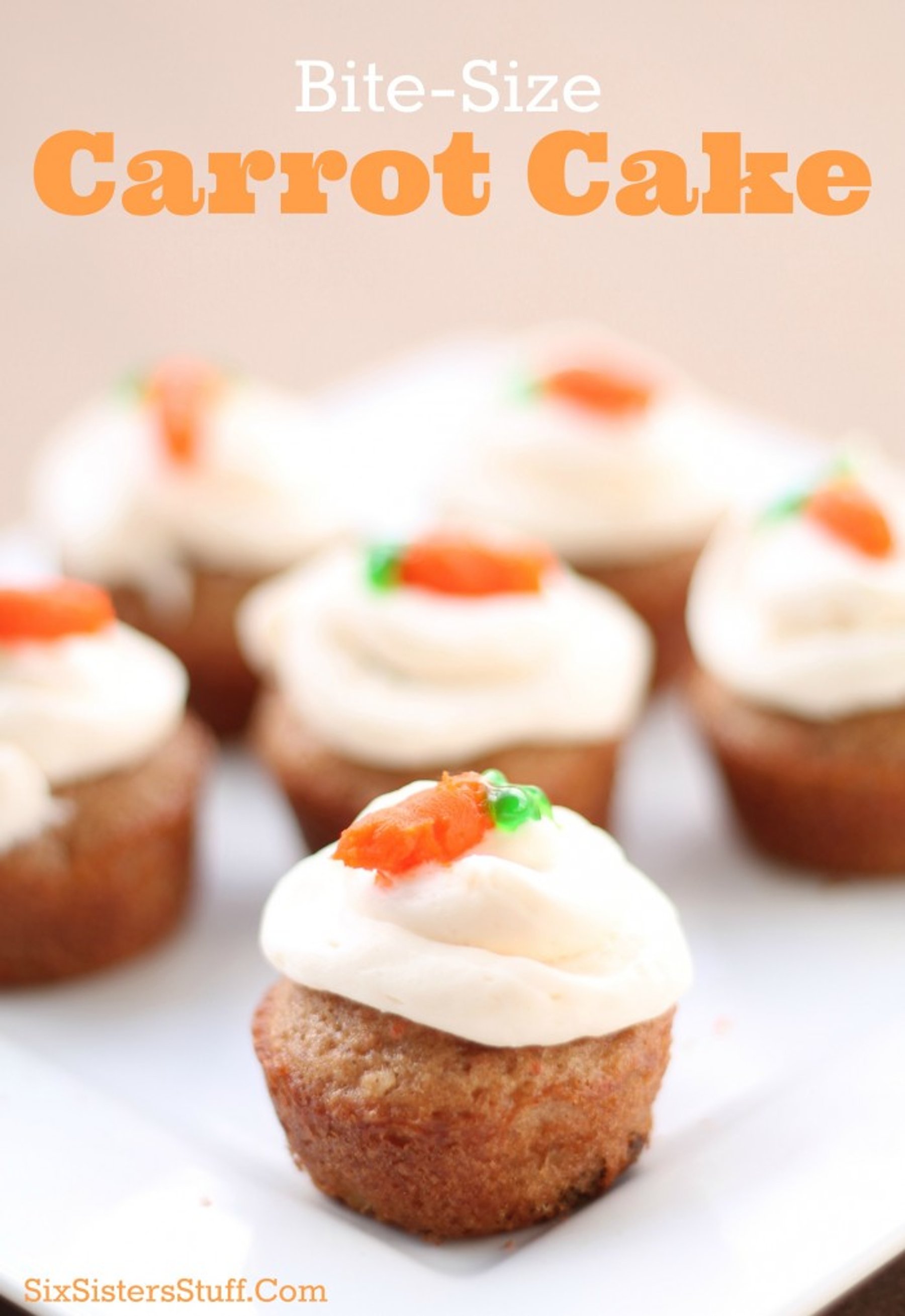 I saw some of these at Paradise Bakery when we were at the Pinners' Conference - and they looked absolutely heavenly! I knew I could make these cute bite-size cakes at home, complete with the carrot on top! Not only do they look great, but they taste great - and it makes a ton!