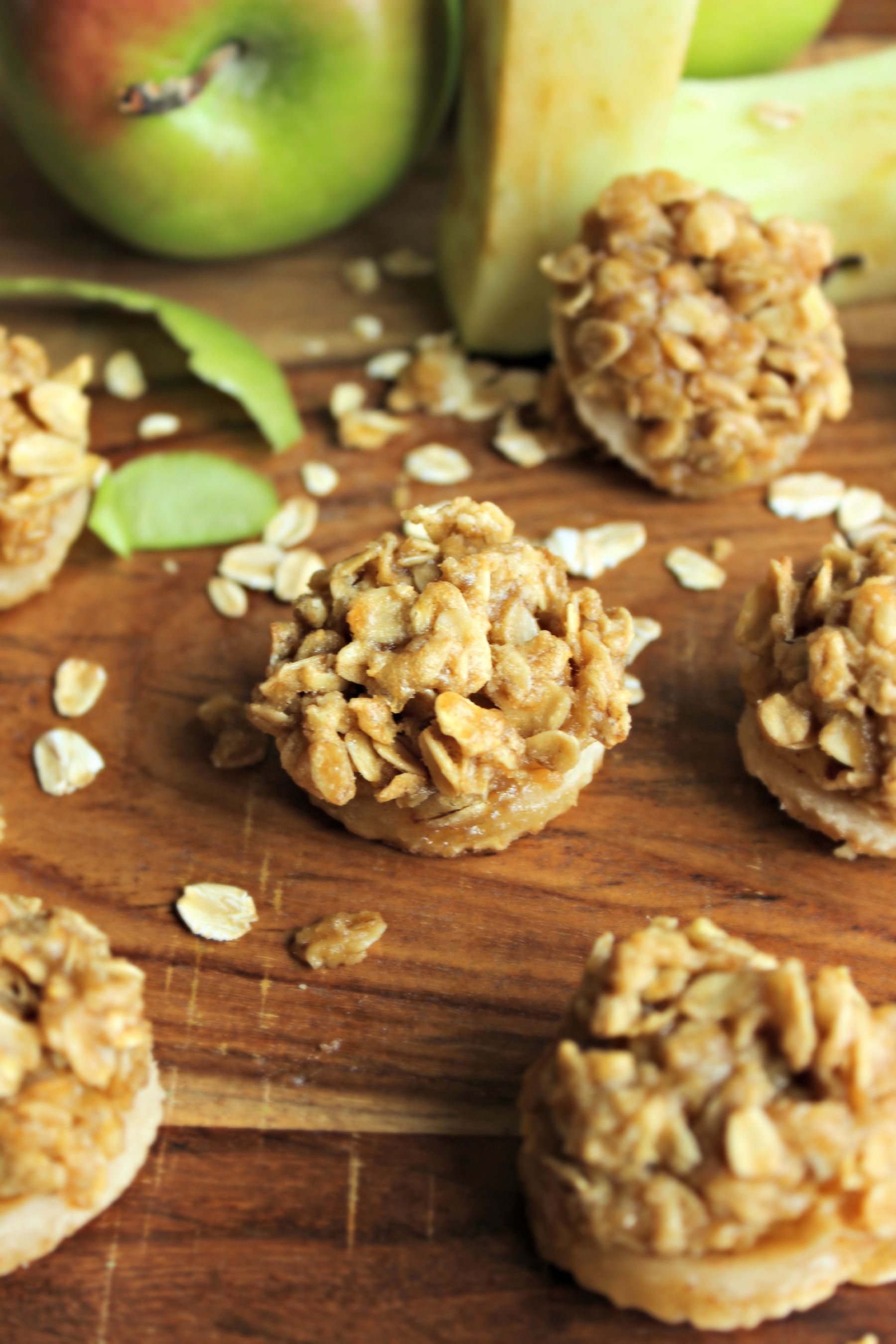 Flaky homemade crust filled with tart sugared apples and topped with a sugary oatmeal crisp all in a mini bite-sized form.