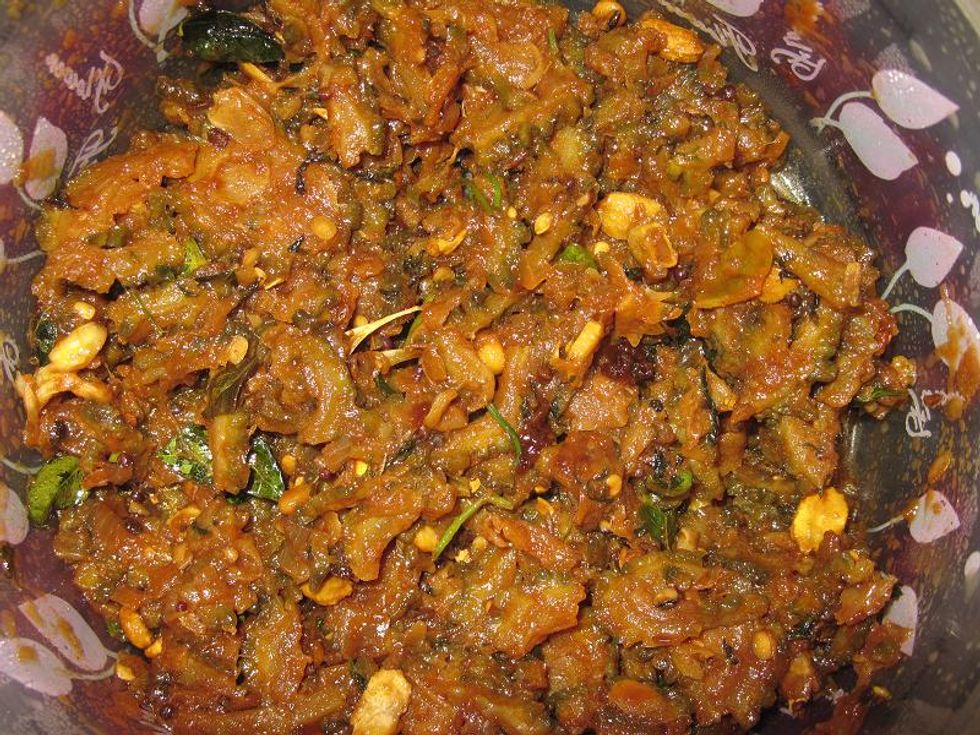 Heat oil in a pan and add chopped onions and little bit salt and fry until golden brown in color. later add bittergourd pieces and fry until golden brown or it turns into slightly yellowish . add red chilli powder and salt and water for it and add tamarind juice to it. cook in medium flame until water get absorbed later add jaggery and fry for few seconds and kept aside.