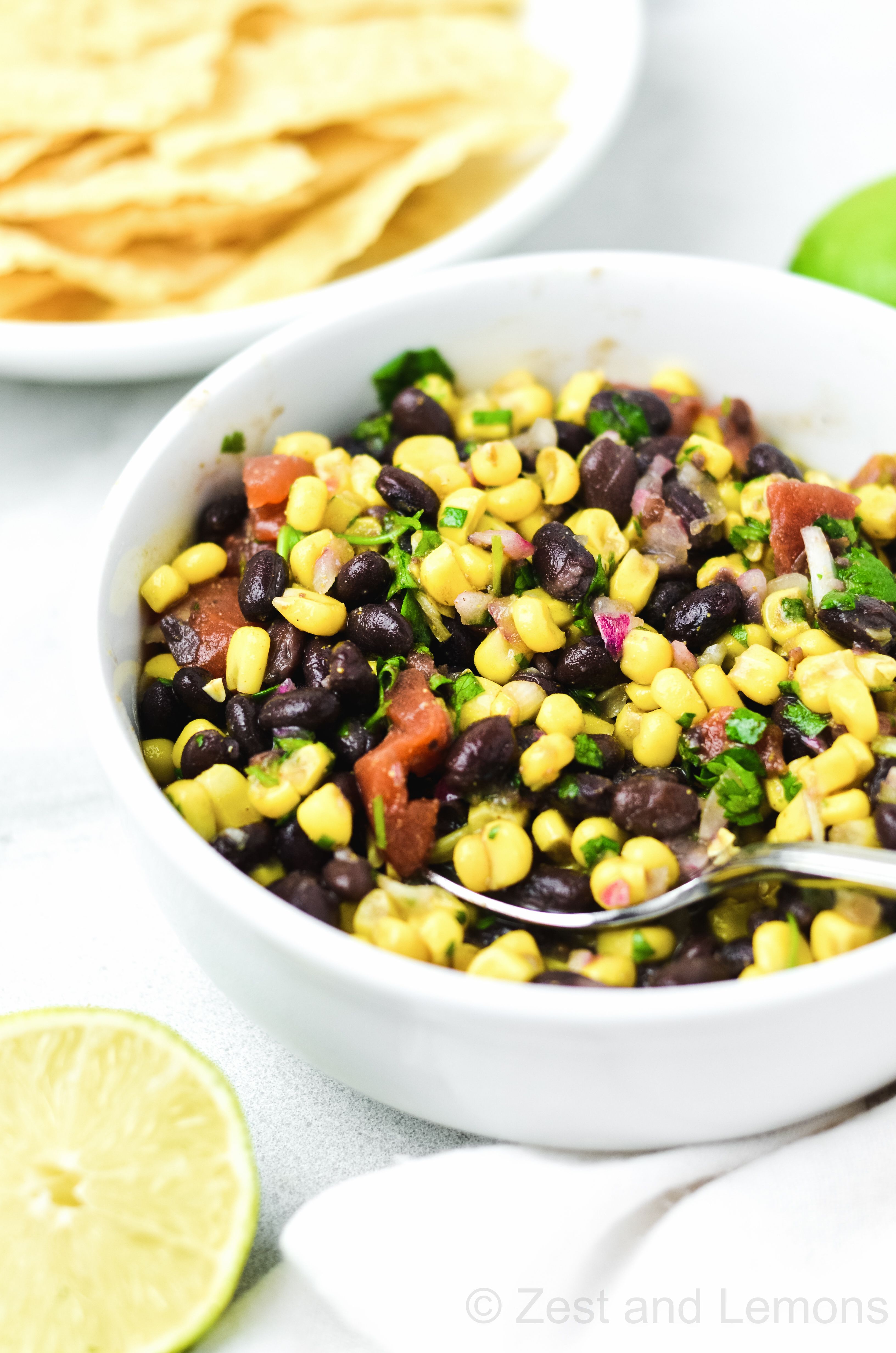 This easy black bean and corn salsa is sure to be a summertime hit! Perfect for tacos or dipping chips.