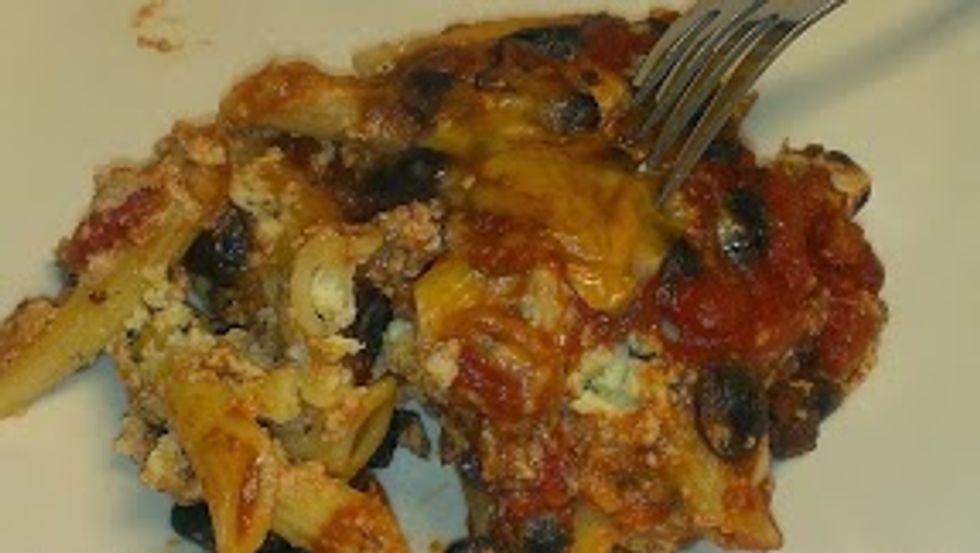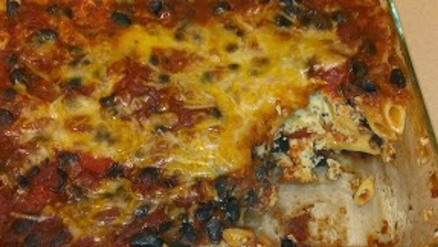 Spread half the cooked penne pasta in the dish. Dollop and loosely spread half of the ricotta mixture over the penne. Dollop and loosely spread half of the bean mixture over the ricotta mixture. Sprinkle with half of the Mexican blend cheese. Repeat penne, ricotta, bean and cheese "layers".