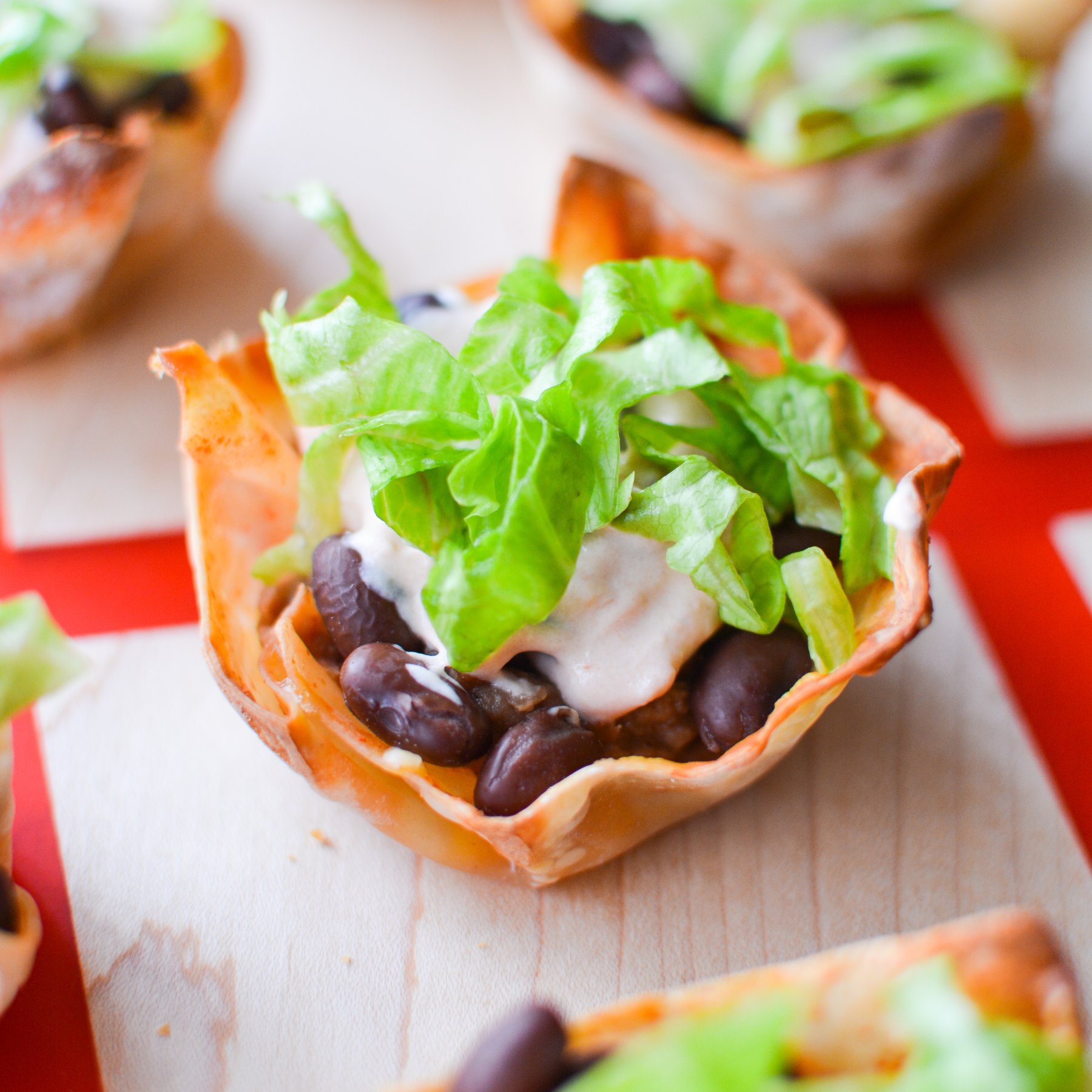 Vegetarian taco dip sits inside crispy wonton wrapper cups baked with hot sauce and cheddar