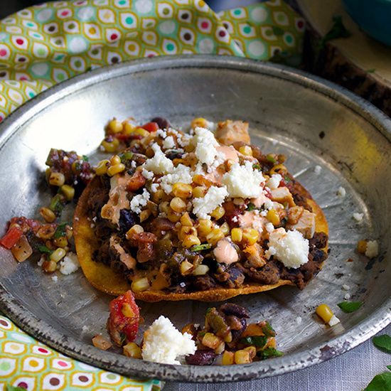 Black Bean Tostadas with Fresh Corn Salsa and Enchilada Cream
