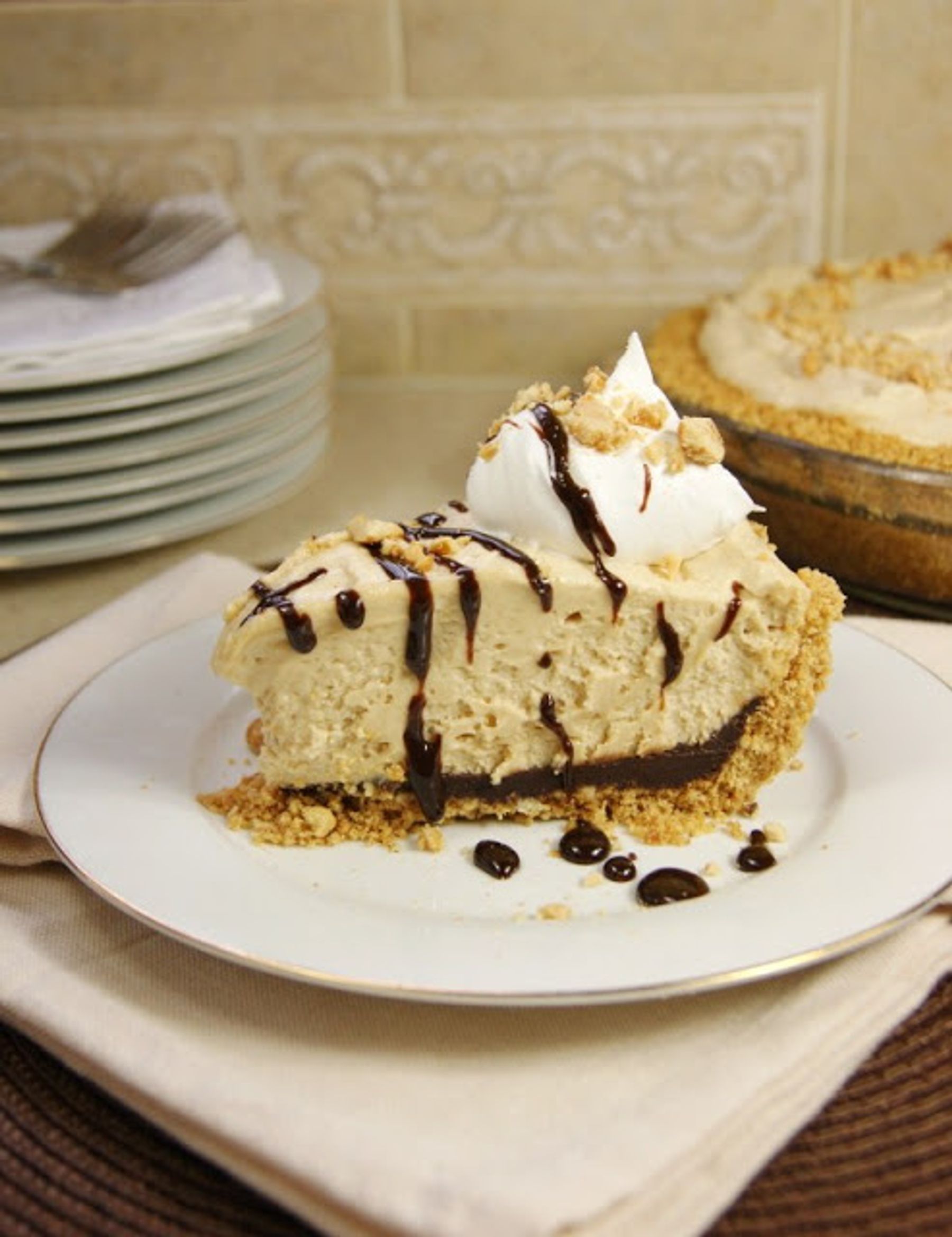 Light and fluffy peanut butter mousse pie ... with a layer of chocolate ganache hiding between the crust and peanut butter filling. Sooo yummy!