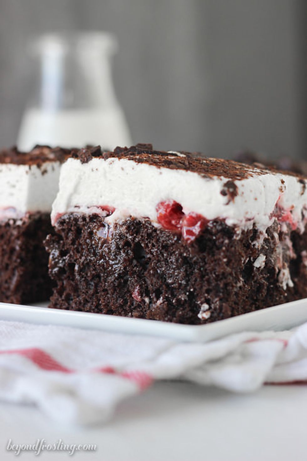 This Black Forest Poke Cake is a gooey chocolate cake filled with hot fudge and cherry pie filling. It is topped with fresh whipped cream and chocolate shavings.