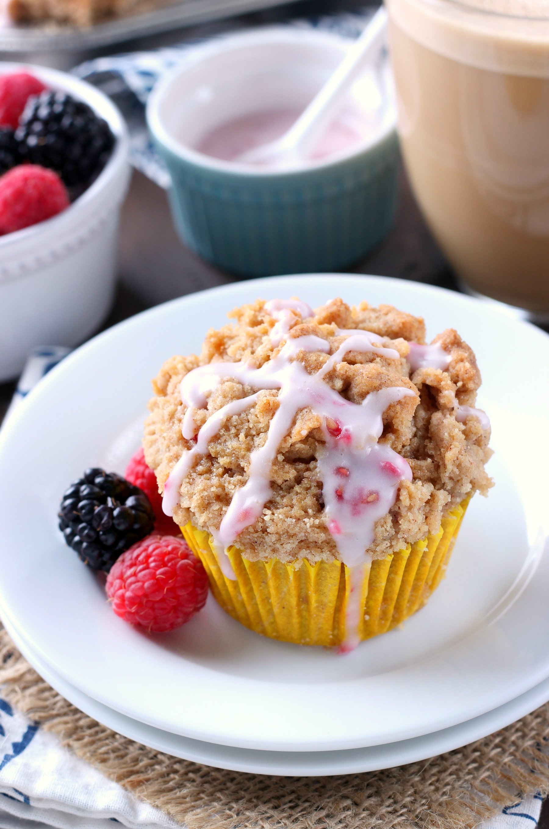 These Blackberry Raspberry Coffee Cake Muffins are perfectly sweetened and tender with juicy blackberries and raspberries, topped with a rich, buttery streusel, and drizzled with a sweet raspberry glaze!