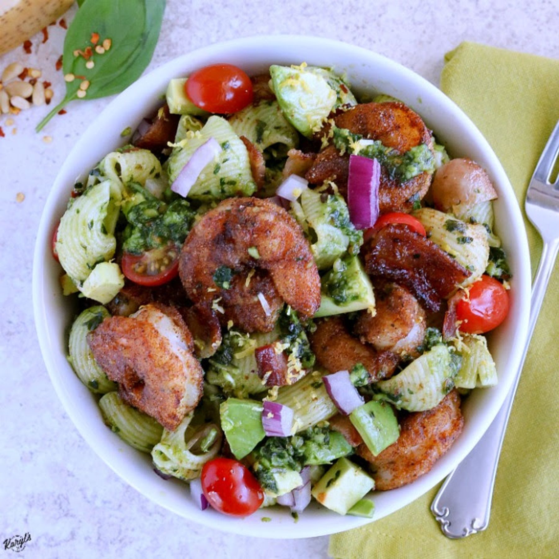 http://karylskulinarykrusade.com/recipe-blackened-shrimp-pesto-pasta-salad/