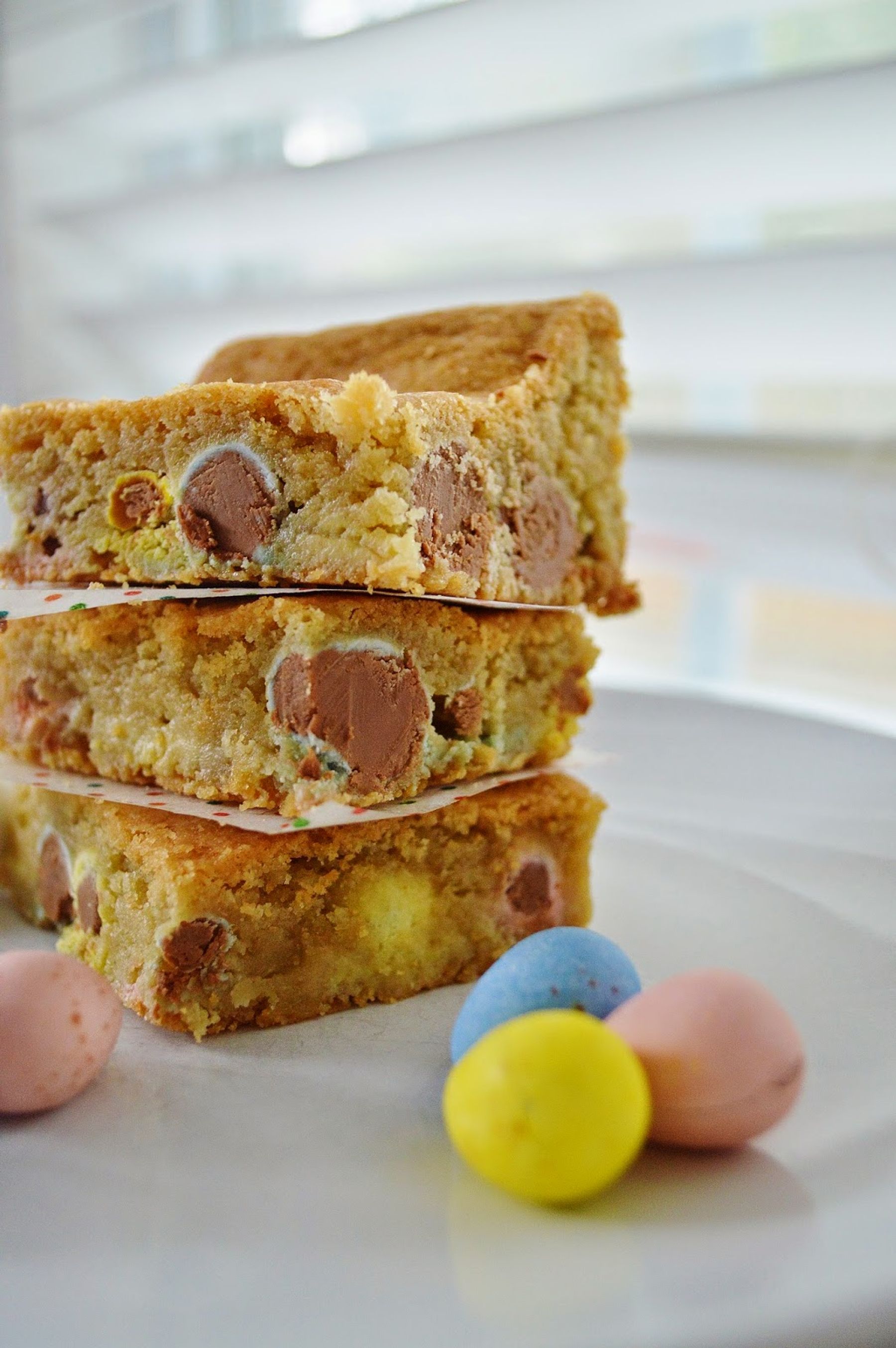 Scrumtious! We devoured this entire pan in like a day. Butter blondies with that crunch of the Cadbury chocolate egg. So good!