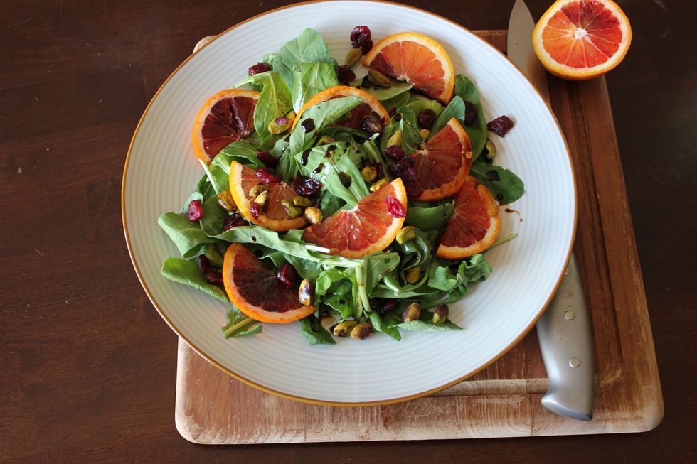 It's Meatless Monday Yummies. We love Meatless Monday, it always challenges us to think outside the box and imagine elaborate flavor combinations we've never tried before. Today's Meatless Monday recipe is a hearty, fall flavored salad that can be served alongside a main course or stand on its own. We combine the juicy, refreshing flavor of blood oranges with the heartiness of arugula, cranberries and pistachio nuts, topping it all off with a small drizzle of balsamic and olive o