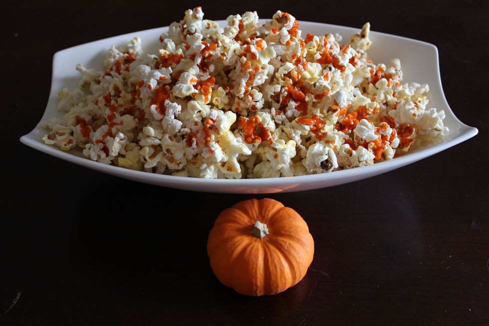 Let the popcorn cook and add it to a large bowl Pour the hot sauce over the popped popcorn and and toss until coated throughout the bowl