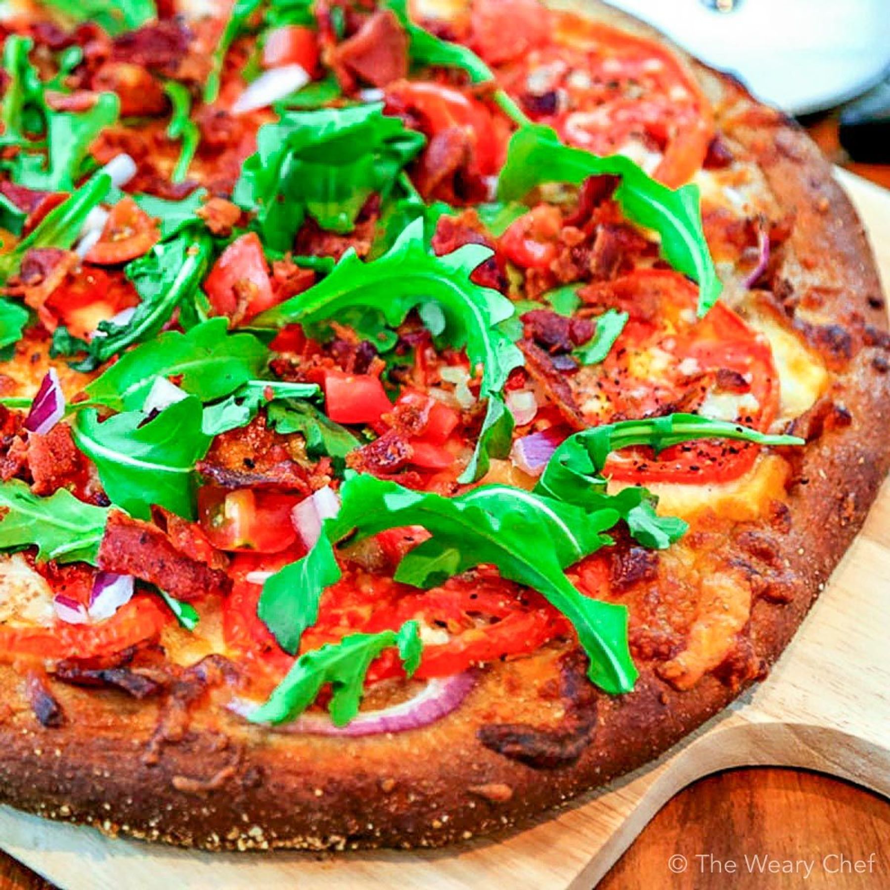 Bite into this BLT pizza loaded with a bacon, red onion, fresh tomatoes, arugula, cheeses, and a garlic-mayo sauce. It's your favorite sandwich turned into a chewy pizza!