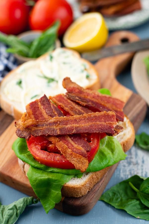 The classic BLT sandwich is about as simple as it gets! Don't let the summer pass you by without indulging in this delicious lunch or easy dinner recipe. Layers of toasted white bread, thick-cut bacon, crisp lettuce, sweet tomatoes, and a quick lemon-basil mayonnaise come together in a magical way! Serve the best BLT sandwich recipe with a side of potato chips and some sliced pickles for a simple, flavorful meal.