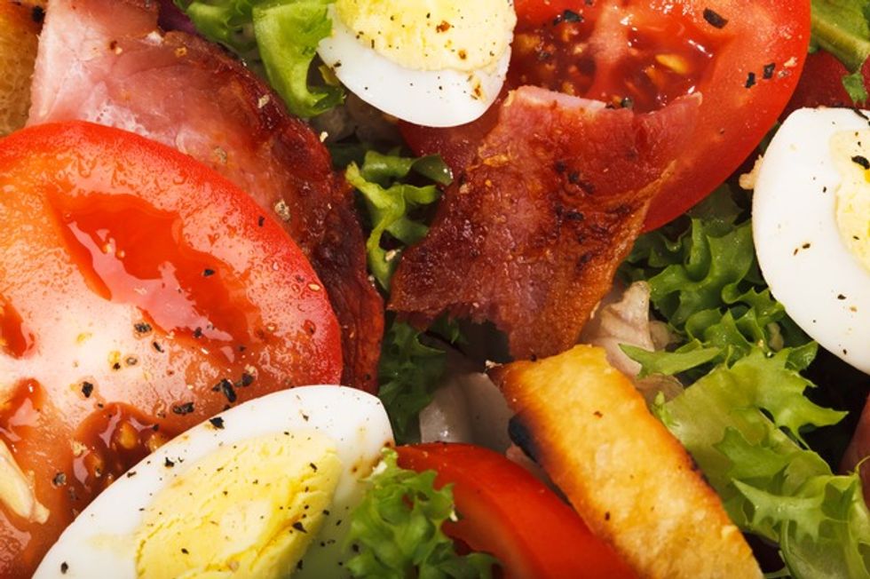 Cook the bacon and eggs in a skillet in the same manner as your would to make a BLT sandwich. In a separate sauce pan add the milk, cream and butter slowly stirring in the flour to thicken. Toast the English Muffins and spread the mayonnaise on them and cut them into small cubes and then line the bottom of a soup bowl using them. Next line the bowl with crumpled bacon and eggs and add a layer of tomato. Pour the sauce into the bowl and then top the dish with the shredded tomato.