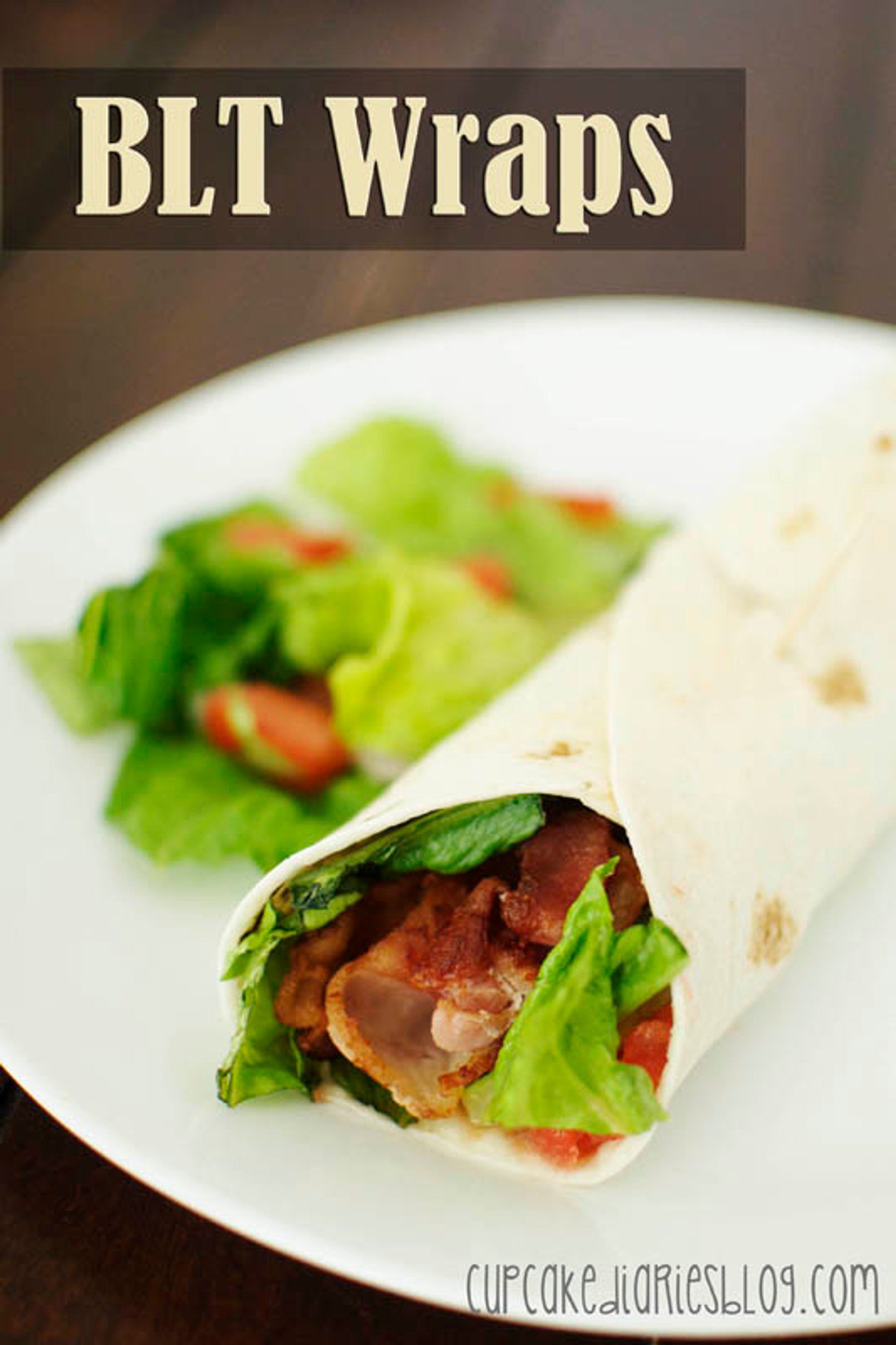 Place tortilla on a plate. Spread mayo over half the tortilla then place bacon slices down the center of the tortilla. Layer lettuce and tomato over the bacon. Roll up the tortilla and serve.