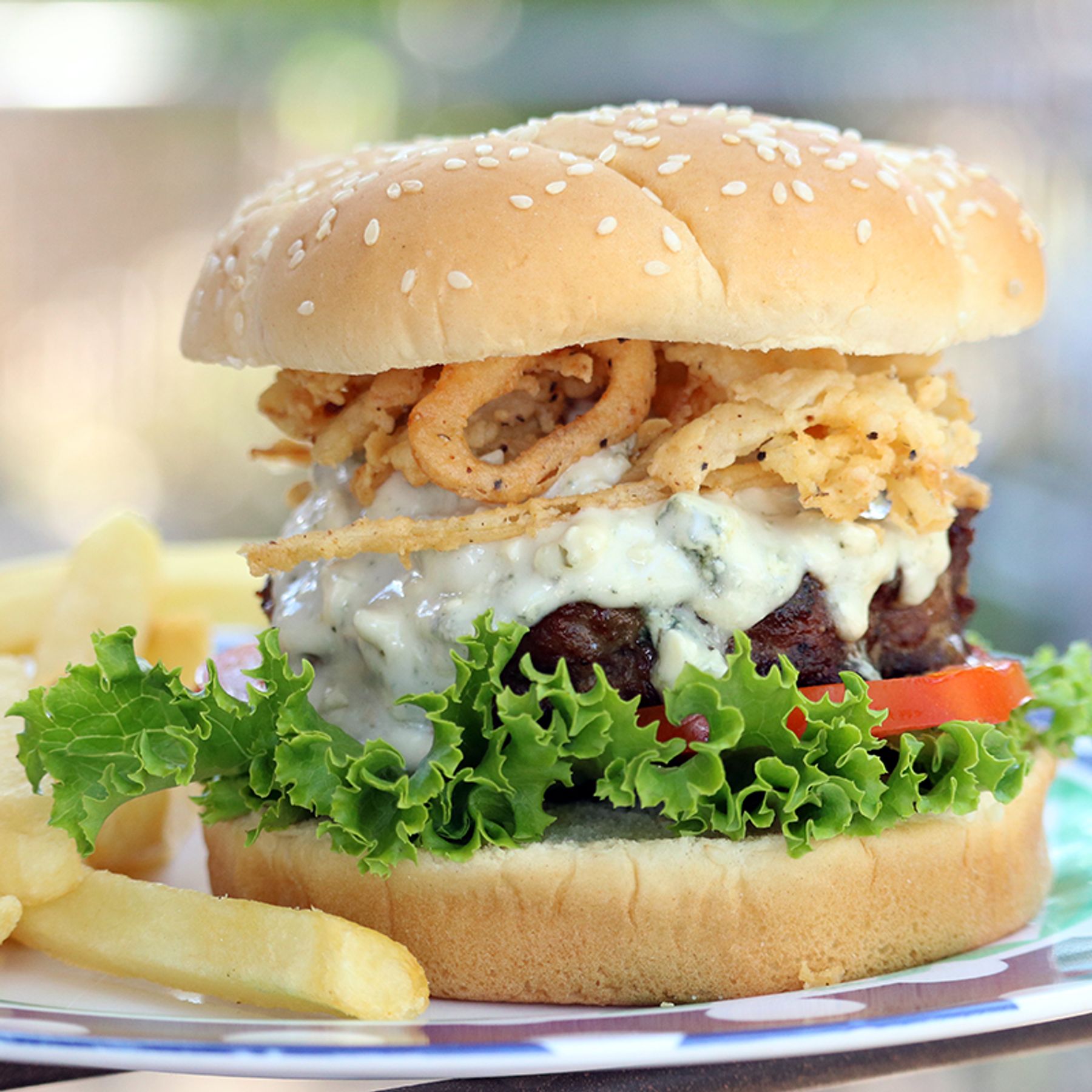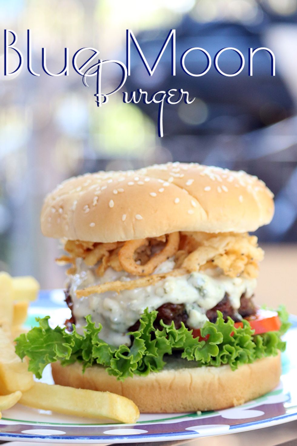 Blue Moon Burger – the ultimate comfort food; seasoned beef topped with a chunky, creamy blue cheese blend adorned with lettuce, tomato, fried onions and a toasted bun.