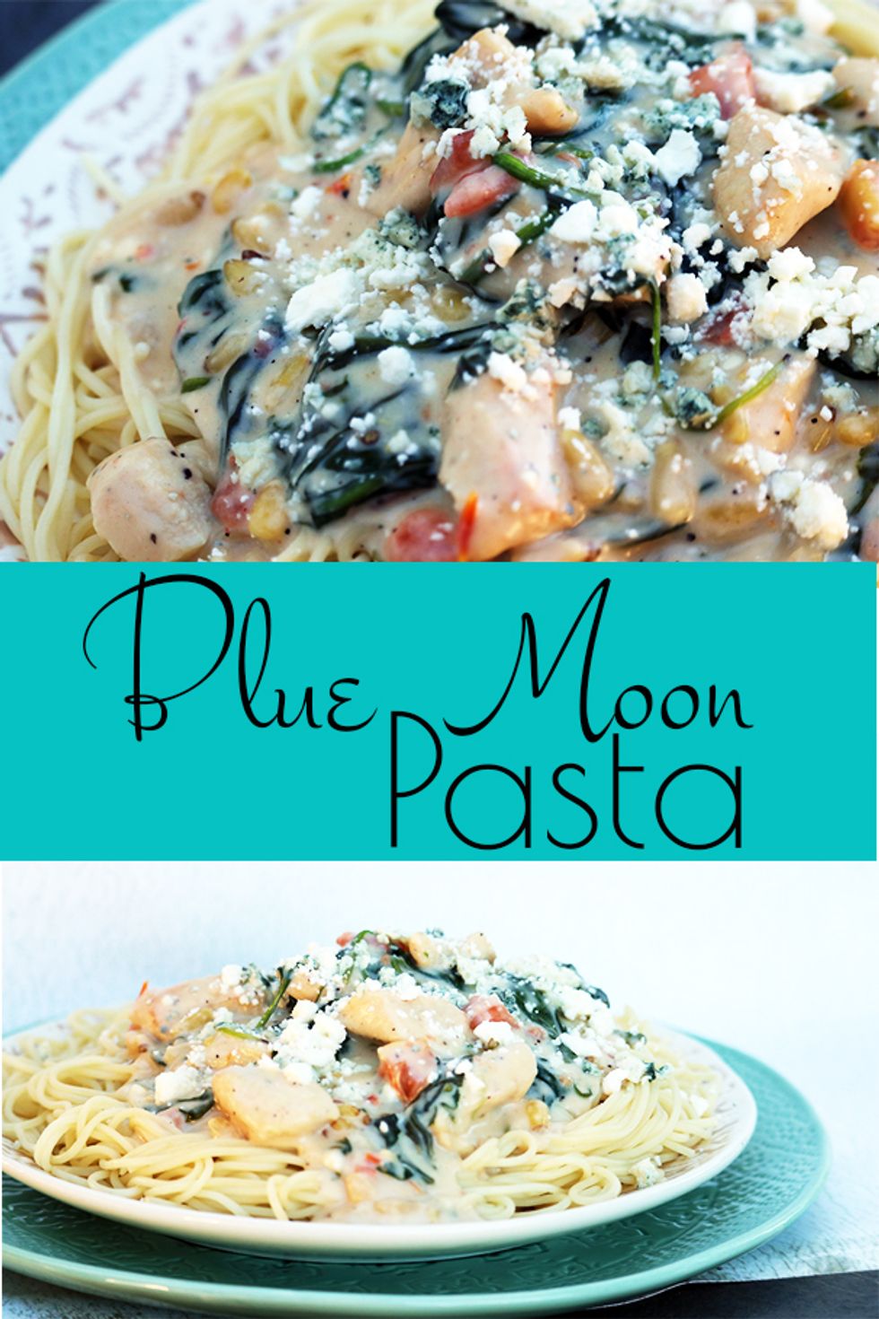 Blue Moon Pasta – a creamy and delicious white sauce with feta and blue cheese, spinach, pine nuts and fresh tomatoes over linguine with tender juicy chicken.