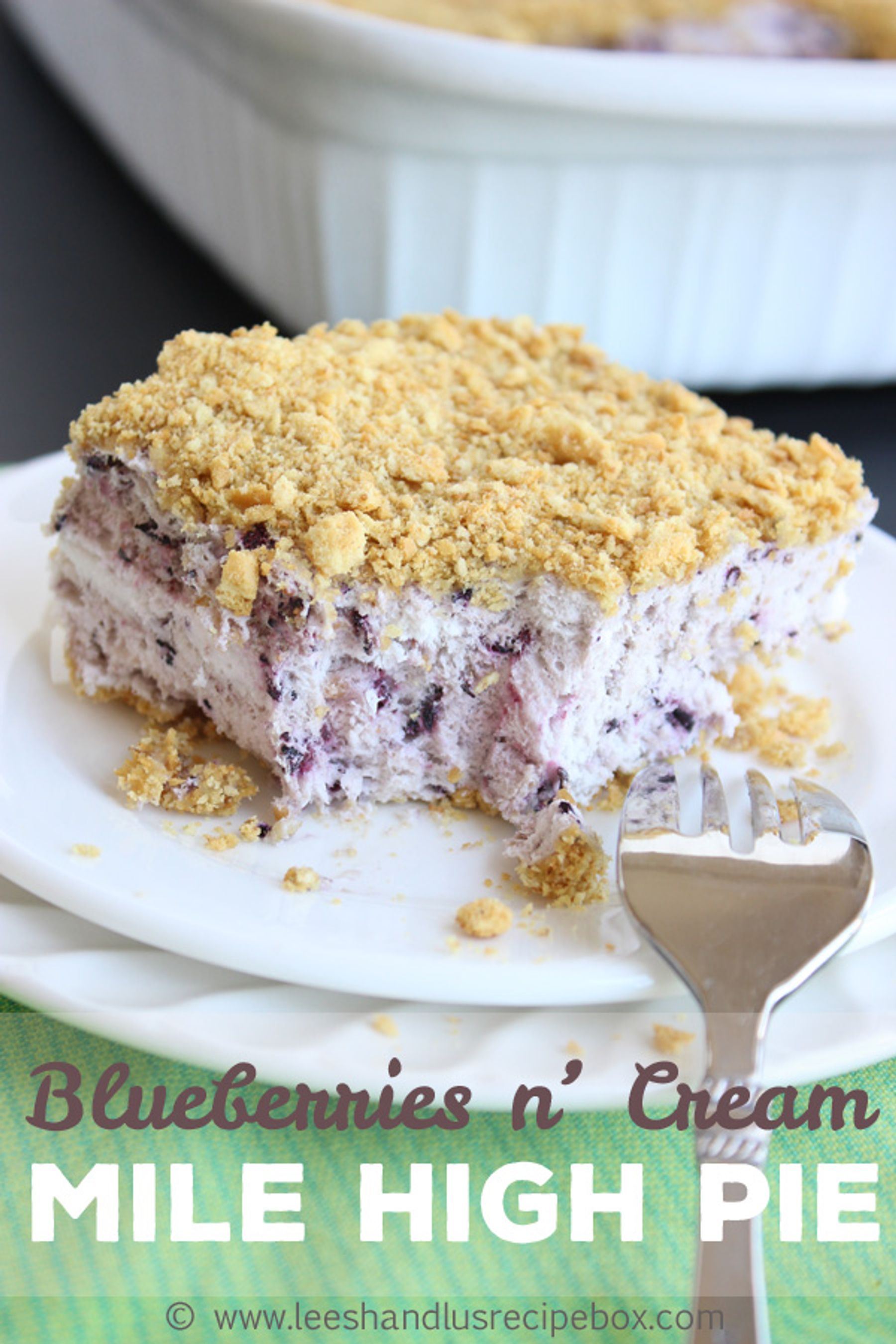 Meet Blueberry N Cream Mile-High Pie! Isnt she a gorgeous?! You can see the beautiful blueberries and swirls of cream throughout. This dessert is unlike any other dessert Ive had. Its so light and fluffy you almost pile it a whole mile high, hence the name.