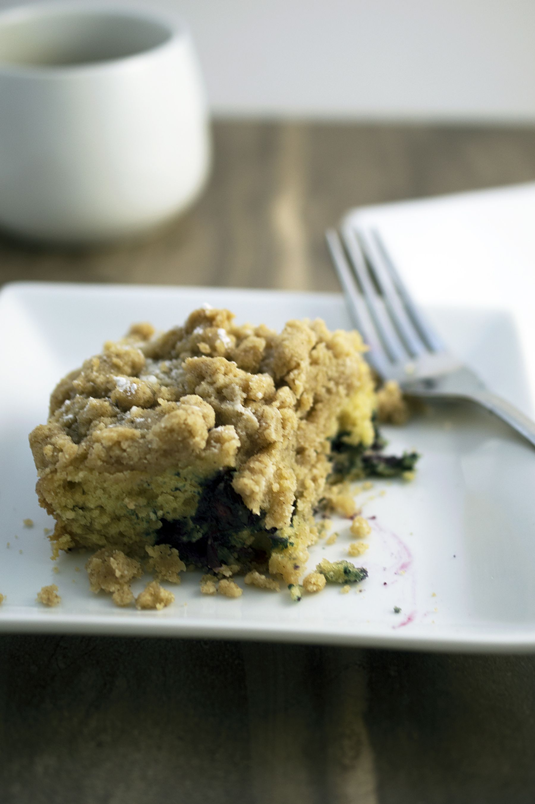 Blueberry and Sour Cream Coffee Cake. Tender coffee cake loaded with crumb topping and stuffed with blueberries.