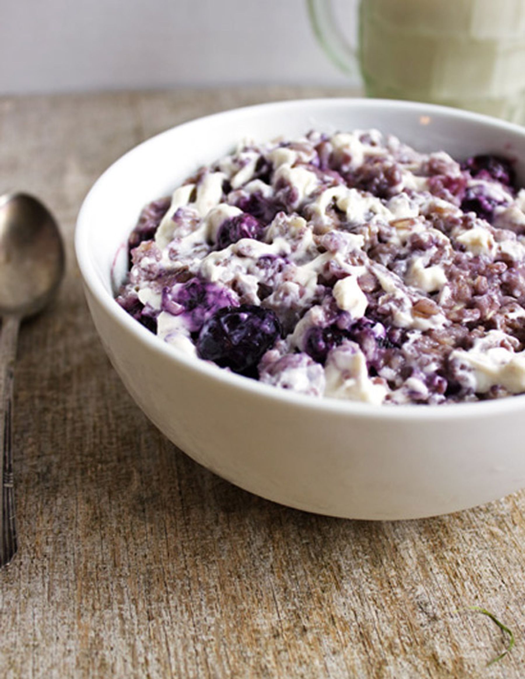 A quick and easy oatmeal recipe swirled with ribbons of creamy cheesecake and blueberries! It’s healthy, low fat and gluten free!