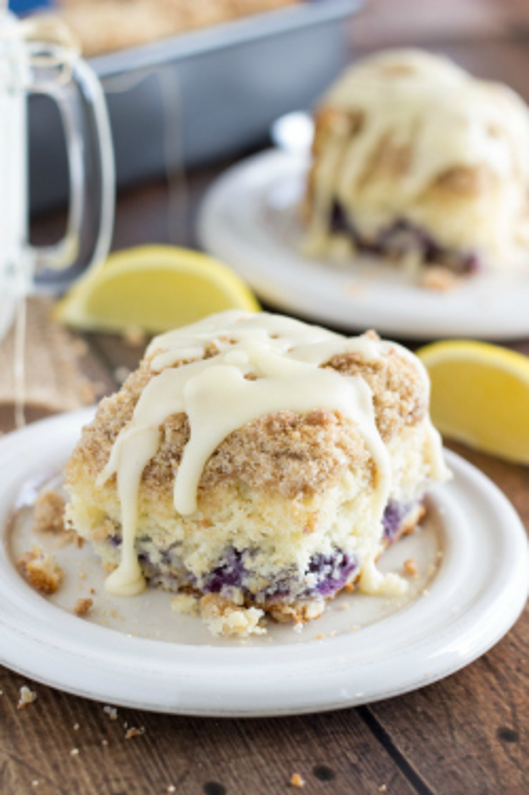 The most delicious and EASY blueberry-filled cinnamon roll cake. Covered with a cinnamon sugar streusel and cream cheese glaze