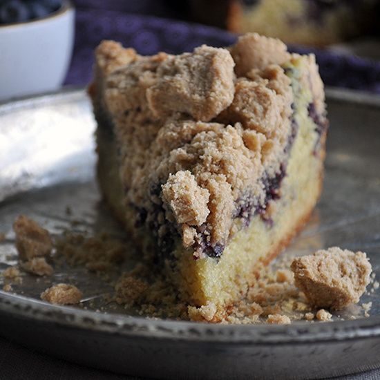 Blueberry sauce is swirled into tender butter cake and topped with a generous layer of New York style crumbs for a blueberry crumb cake that's perfectly at home at the breakfast table, next to your afternoon mug of coffee or tea, or sliced up and served after dinner.