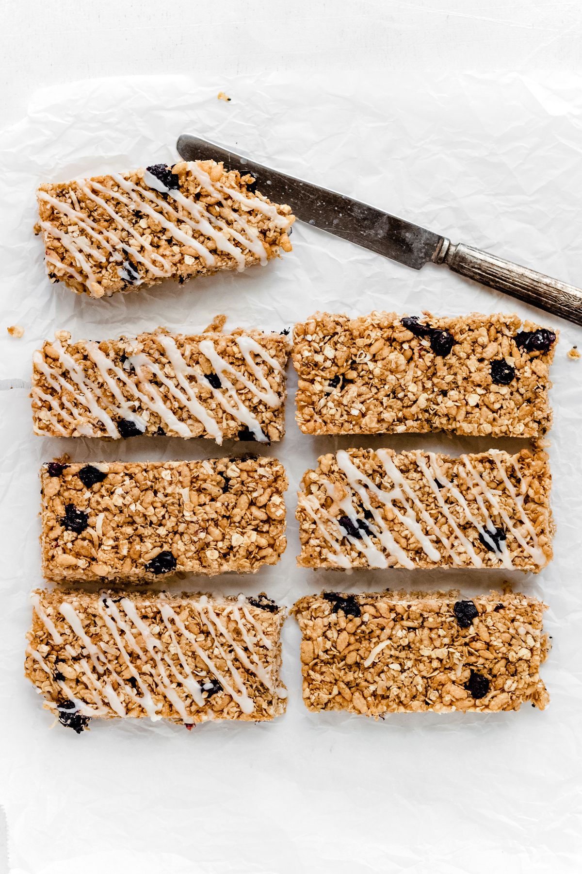 The best chewy Blueberry Granola Bars drizzled with a Greek Yogurt Glaze - secretly healthy with chia seeds, flaxseed, and coconut oil.