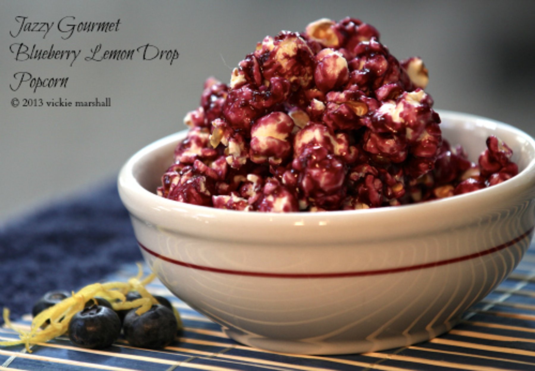Crunchy popcorn is drenched with a sweet and zingy buttery blueberry lemon coating to create a unique alternative to caramel corn.