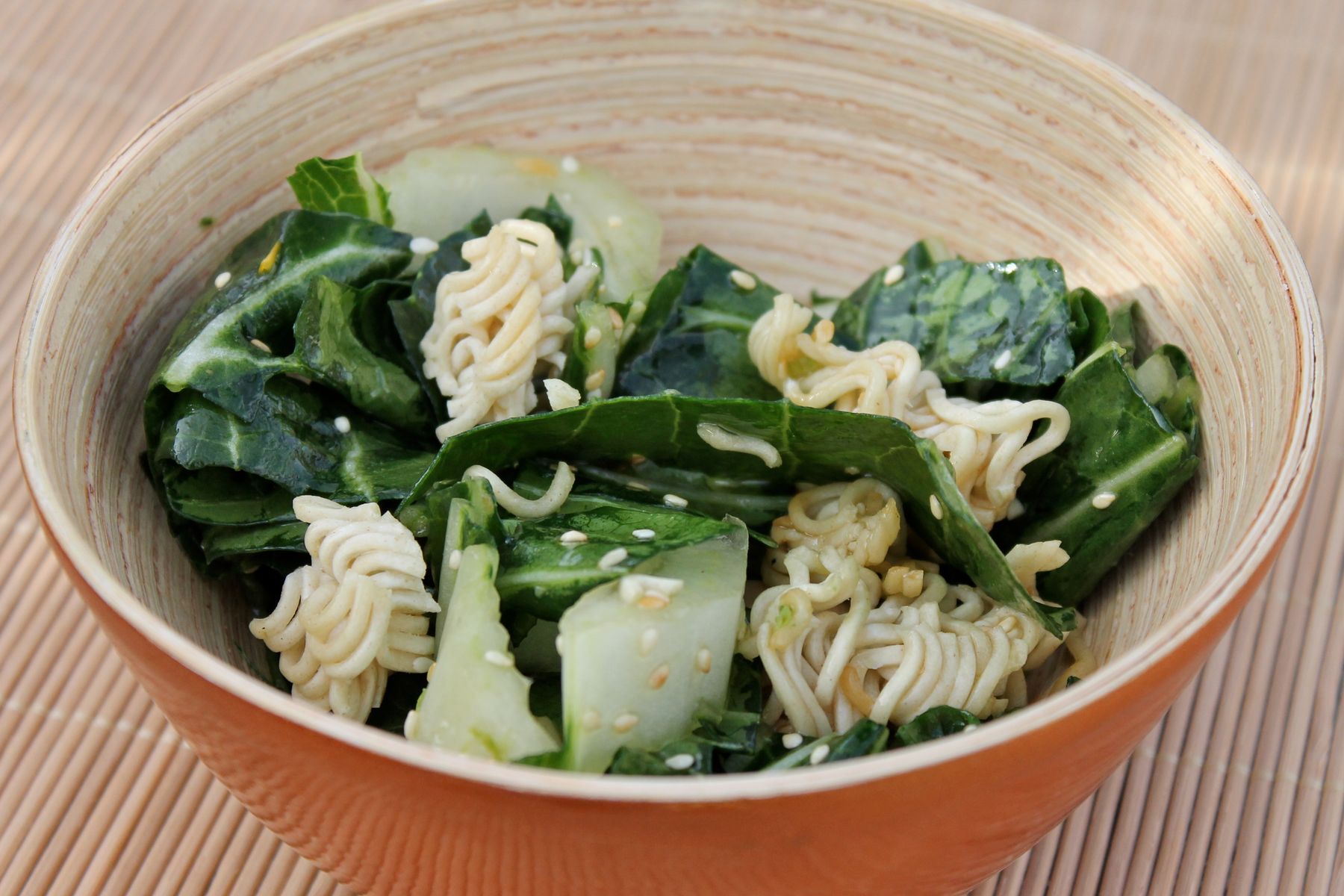 Melt butter in a large skillet. Add almonds, sesame seeds, and ramen. Saute until golden. Remove from heat.