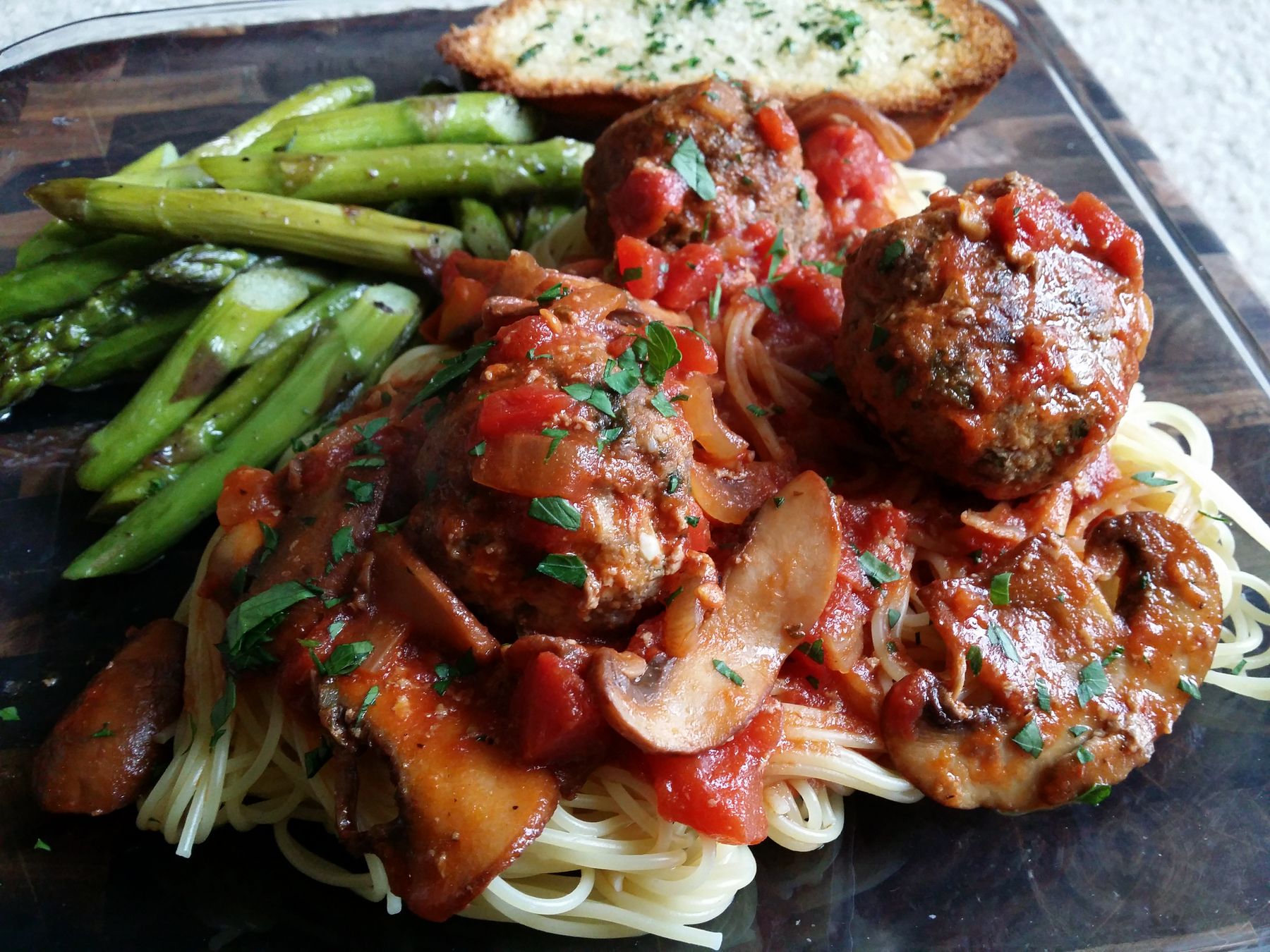 Simple. Spicy meatballs in a light tomato mushroom wine sauce.