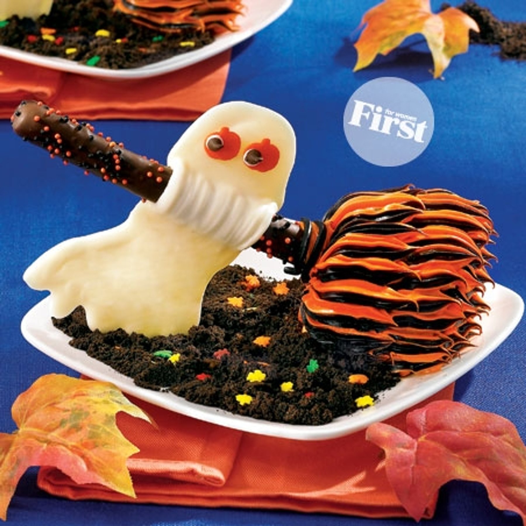 We gave our cupcakes a trick-or-treat twist by setting them on their side before coating with striped frosting. Then we added chocolate-covered pretzels and white-chocolate ghosts to create a "flying broomstick" effect.