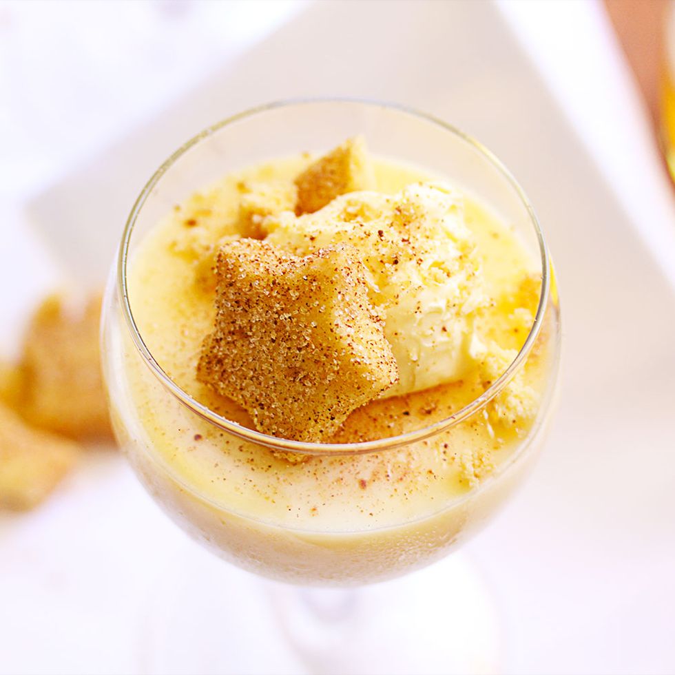 1. Pour the eggnog into a saucepan, then add the Drambuie and stir well. Sprinkle the gelatine evenly over the top and leave it for 5 minutes to bloom.