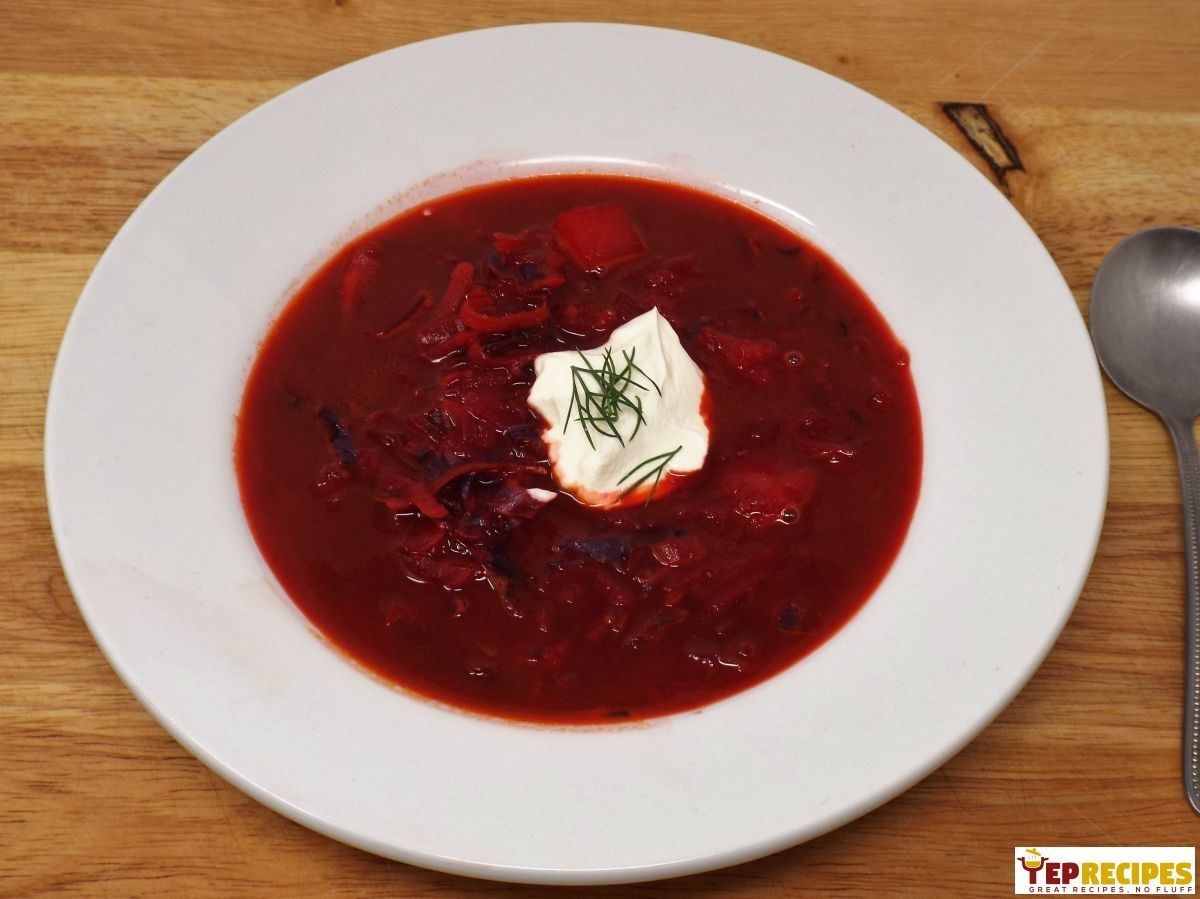 A classic Russian beet soup made with vegetables and beef broth then topped with sour cream and fresh dill.