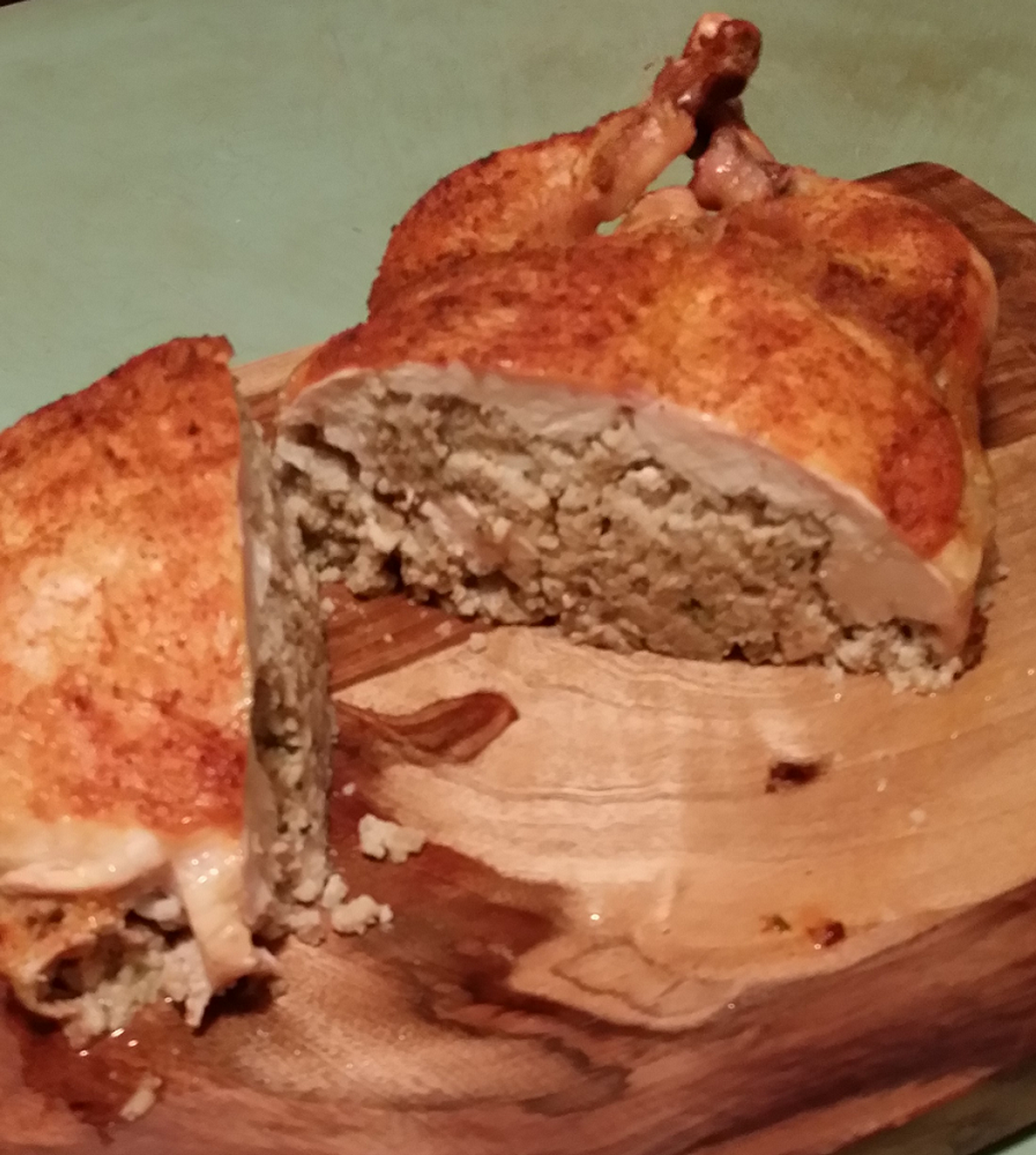 First you will need to debone the chicken. I have provided a video of this and a complete tutorial of how you will need to start and how you will need to stuff the chicken. The rice dressing can be bought...