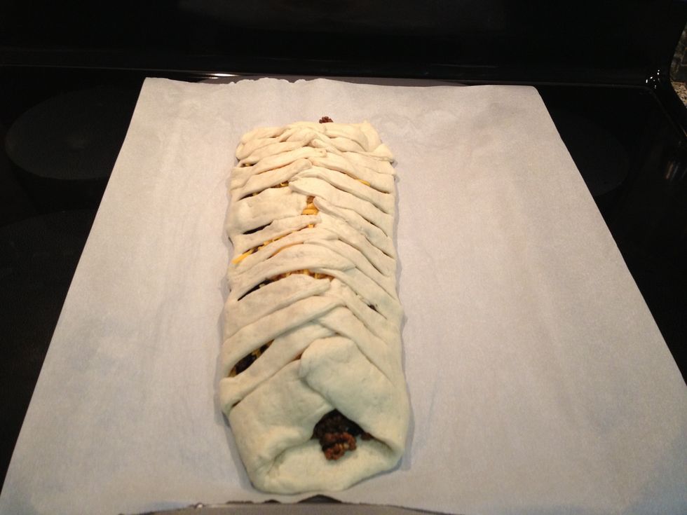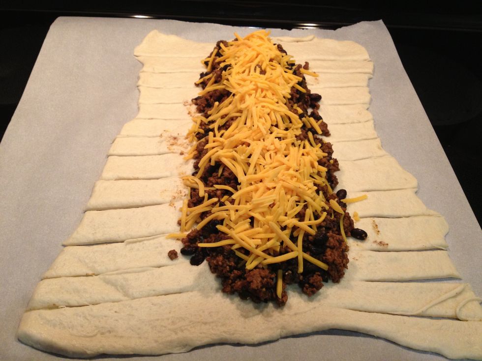 1/ In a skillet, brown 1lb of ground meat. Season with your favorite taco seasoning. When meat is just cooked through add half of a small onion and let cook a few minutes. Adding the onion now keeps it slightly crunchy. Rinse and drain 1- 15oz can of black beans. Add to meat. Drain 1 can of rotel tomatoes. Add to meat. Heat til mixture is hot through out. 2. Line a baking sheet with parchment paper (makes clean up easy). Roll out 1 package of crescent roll onto baking sheet. Mend the perforations. 3. Cut crescent sheet on both sides 1inch apart. A pizza cutter works well 4. Put cooked meat mixture in center of cut crescent sheet 5. Put 2 cups of grated cheddar cheese on top of meat mixture 6. Fold crescent strips over meat mixture and press the strips together to seal the braid. 7. Bake in 350° oven for 20-25 minutes or until golden brown 8. Let sit for 5-10minutes to allow the Taco Braid to set.