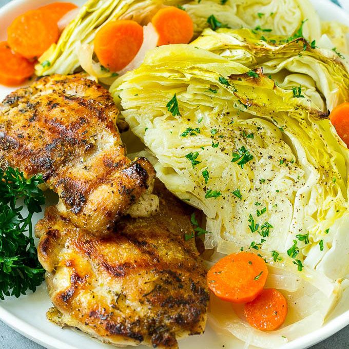 - Arrange the cabbage wedges in the baking dish, then scatter the carrots and onions around the cabbage.