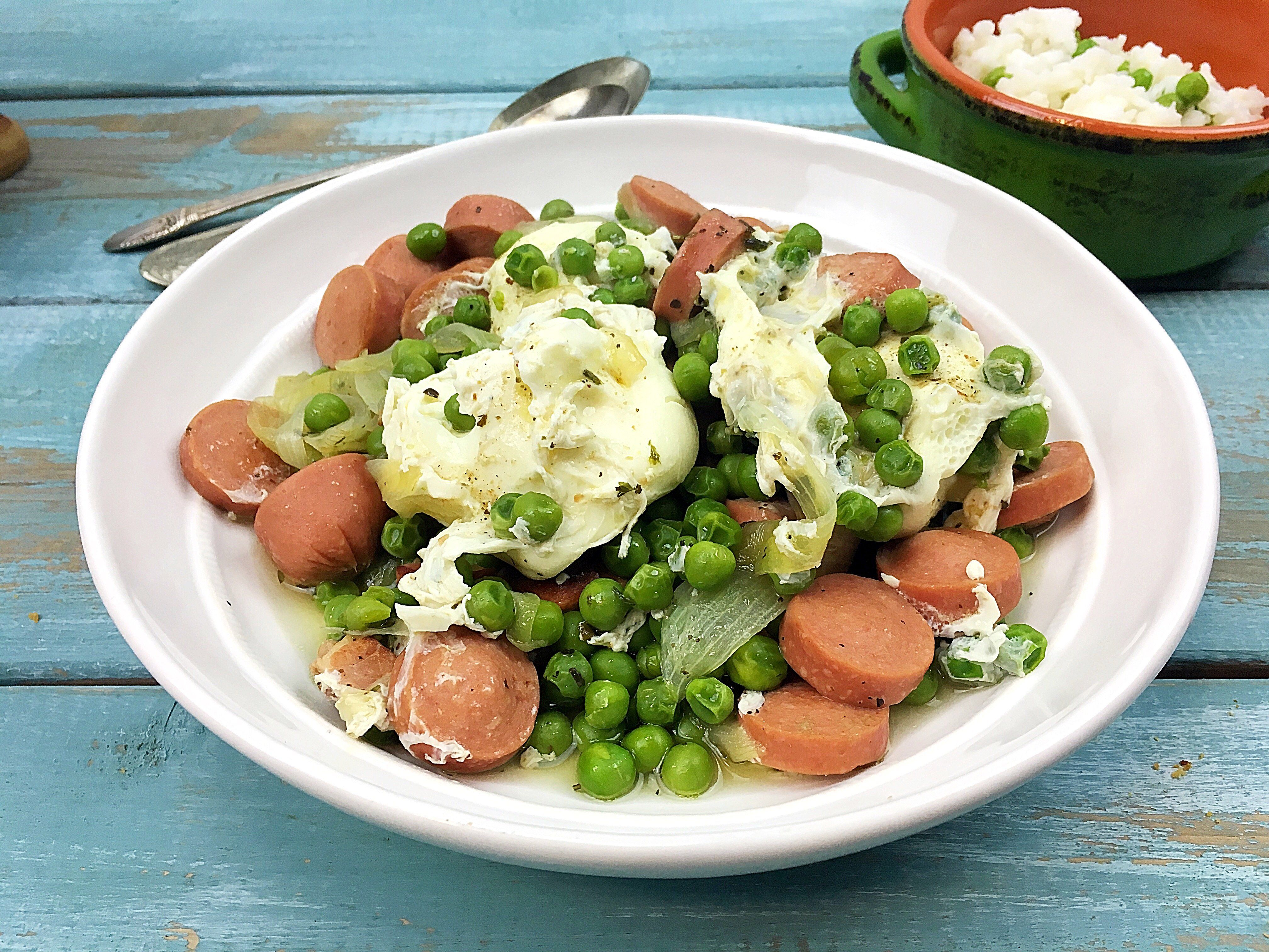 A traditional family recipe, 'Ervilhas com ovos escalfados'. Portuguese comfort food with smoked sausage, green peas and poached eggs. Perfect for any day of the week!