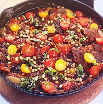 Braised Wagyu Beef, Shallot, Tomato, and Basil Skillet