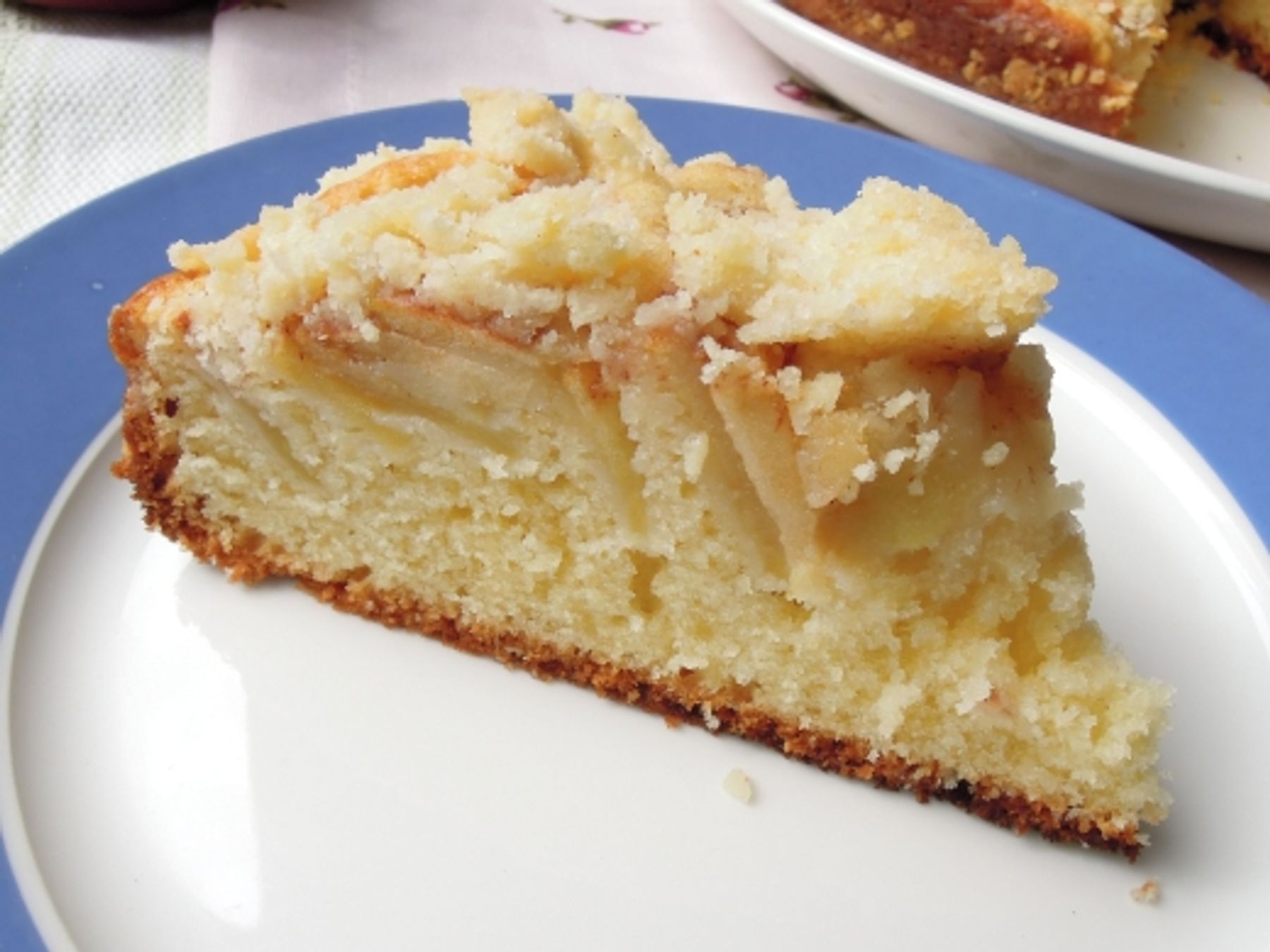 5. Spoon around a third of the mixture into the tin and smooth the surface. Put the apple slices into the lemon juice and add the cinnamon. Spoon this over the cake mixture, making an even layer. Spread the remaining cake mixture over the apple layer to the edge of the tin. Make sure the apples are covered. Smooth the top with the back of a wet spoon and sprinkle generously with sugar.