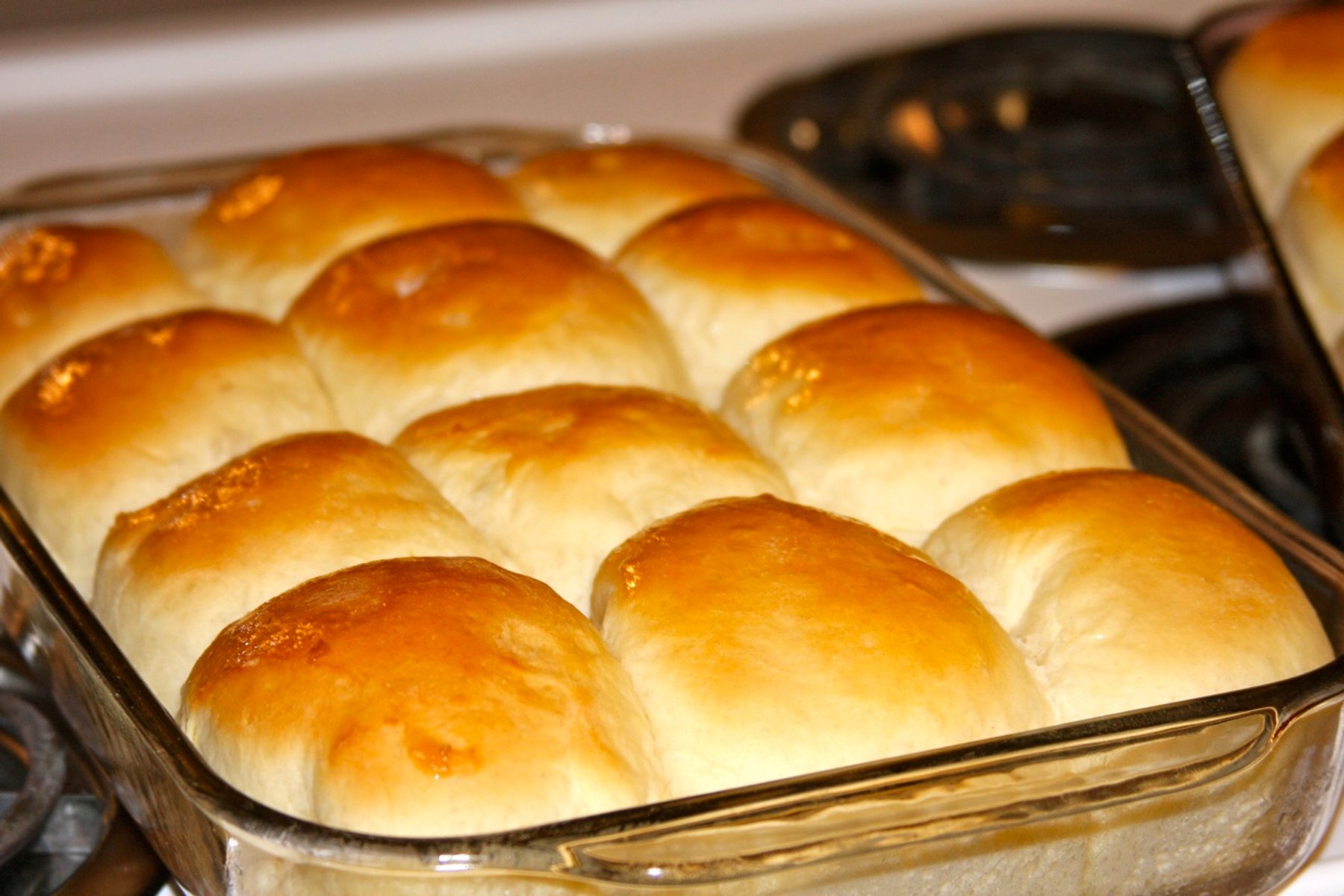 When the dough is done, you separate it into 12 balls and place in greased 9x13 pan, cover and let rise for 1 hour. Bake at 350 for 10-15 minutes.