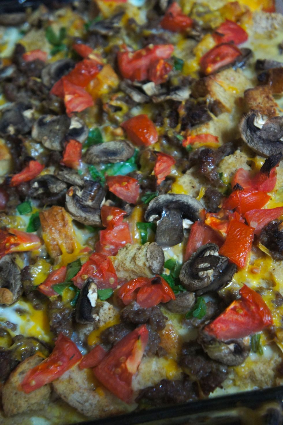 A delicious breakfast casserole with French bread, eggs, sausage and vegetables.