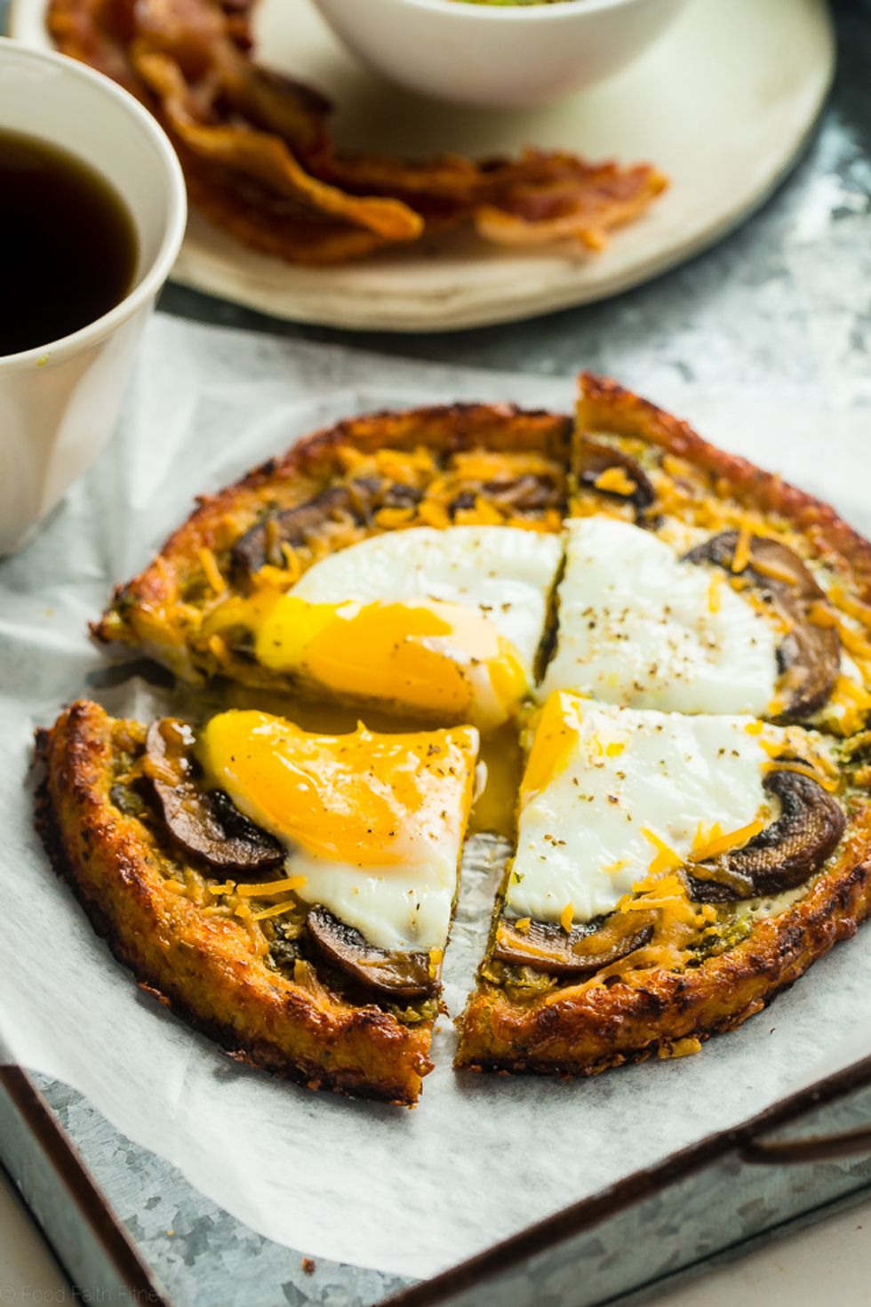 This healthy breakfast cauliflower pizza has soft eggs and a leek bacon pesto. You’ll never know it’s secretly high in protein, gluten free and low carb! You could even serve it as breakfast for dinner!
