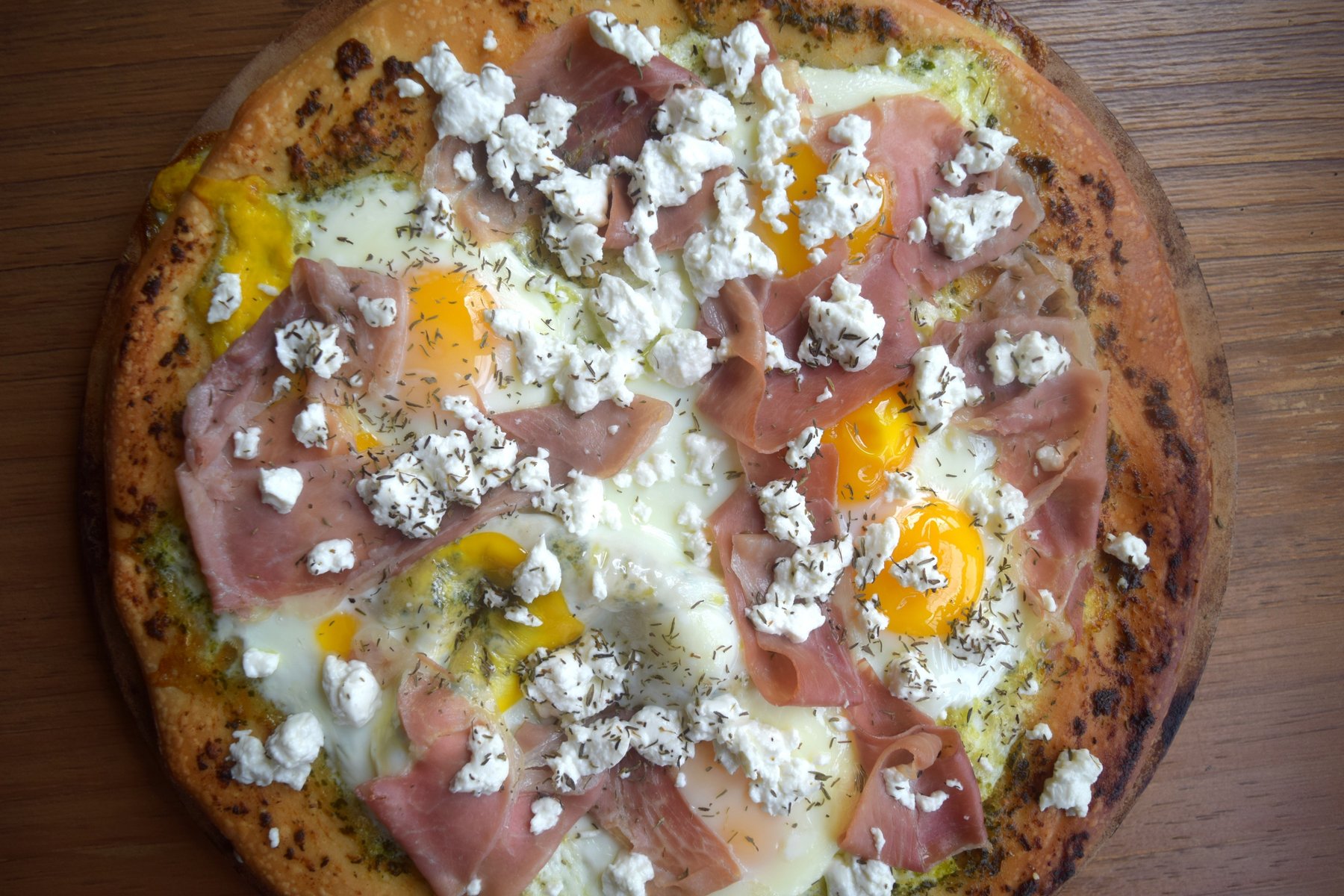 Eggs, prosciutto and pesto breakfast pizza