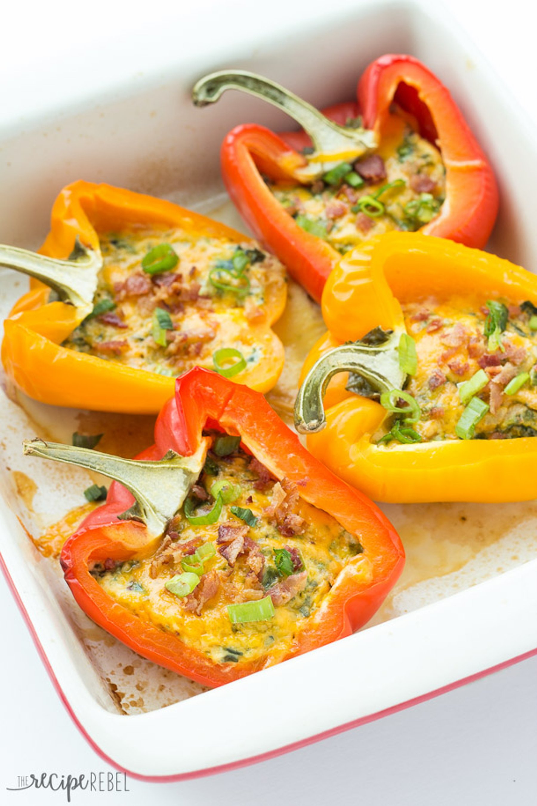 Breakfast Stuffed Peppers with cheese, bacon and spinach (or use whatever fillings you like!) — cook them in the oven or the slow cooker! A great, healthy breakfast, lunch or dinner.