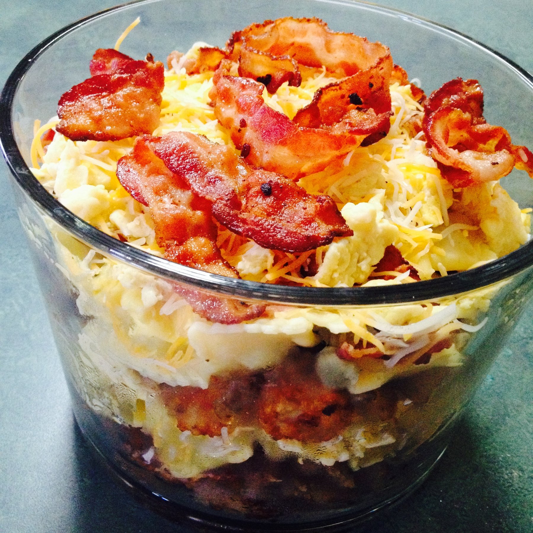In a large skillet break up and brown sausage, set aside on paper towel to drain excess fat. Using the same skillet cook bacon, also set it aside on paper towel to drain excess fat. In a large pot, cook tortellini according to package instructions. While waiting for the tortellini to cook, preheat oven and bake tater tots according to package instructions. Melt butter in another large skillet and scramble eggs, adding salt and pepper to taste. Now you are ready to start layering! In a large trifle bowl start with tater tot crowns, then sausage, eggs, bacon, tortellini, cheese and repeat layers. Enjoy!